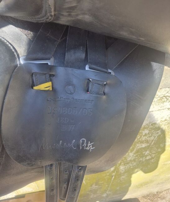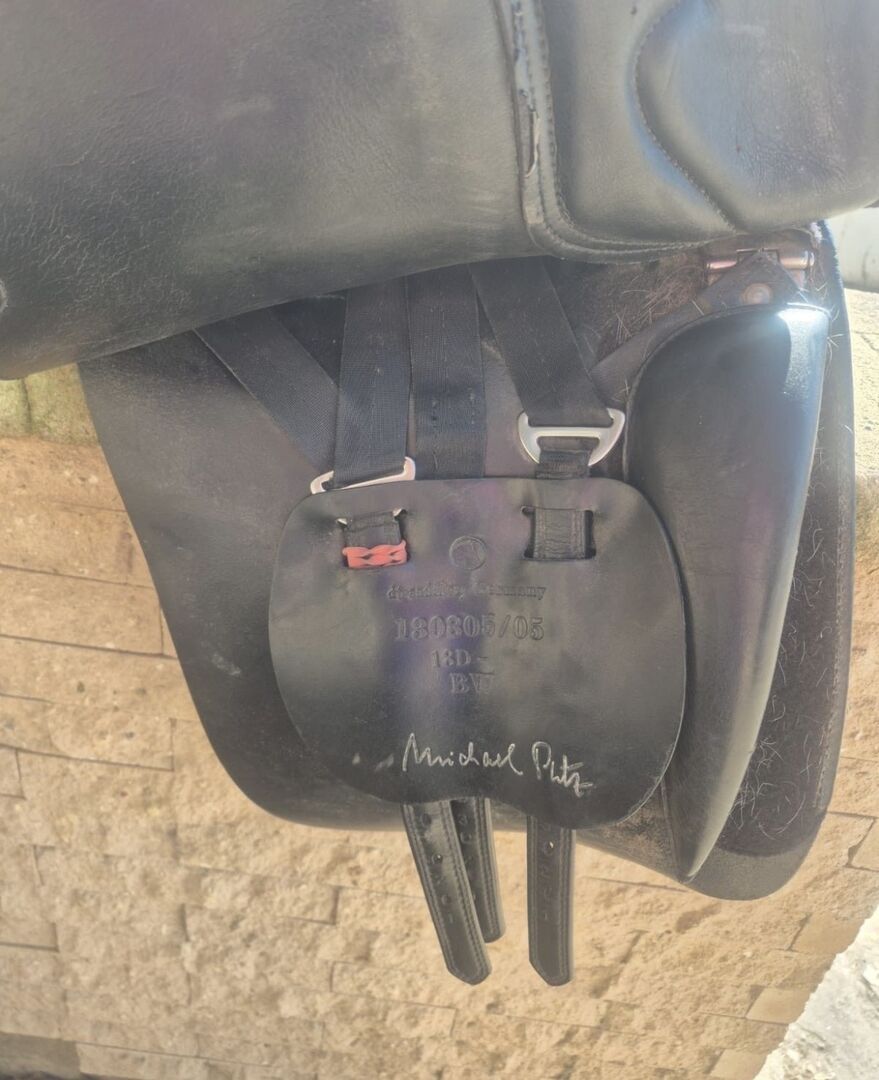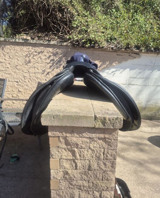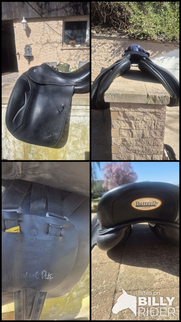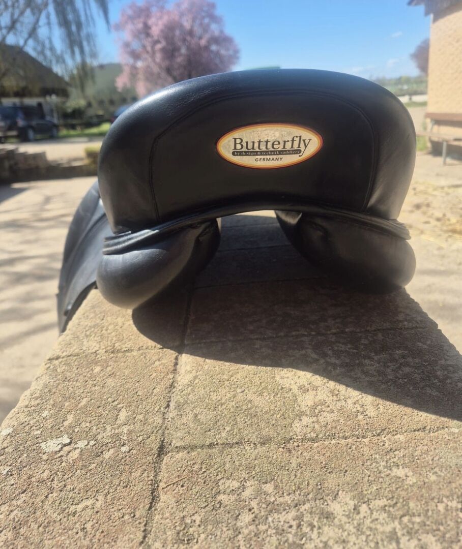 Vlinder Dressuurzadel - Ik bied een 17 inch Butterfly dressuurzadel aan. Het merk staat bekend om zijn goede aanpassing aan het paard dankzij een beweegbaar scharnier in plaats van een vaste slokplaat, die zich perfect aanpast aan de rug van het paard en een goede bewegingsvrijheid biedt.