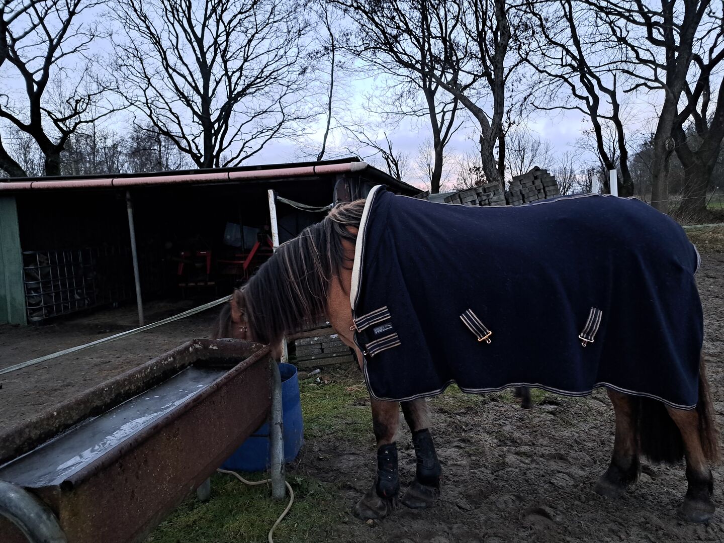 Vloerkleed in 135 van Krämer - Donkerblauw met roségouden bandjes en teddybontkraag in maat 135