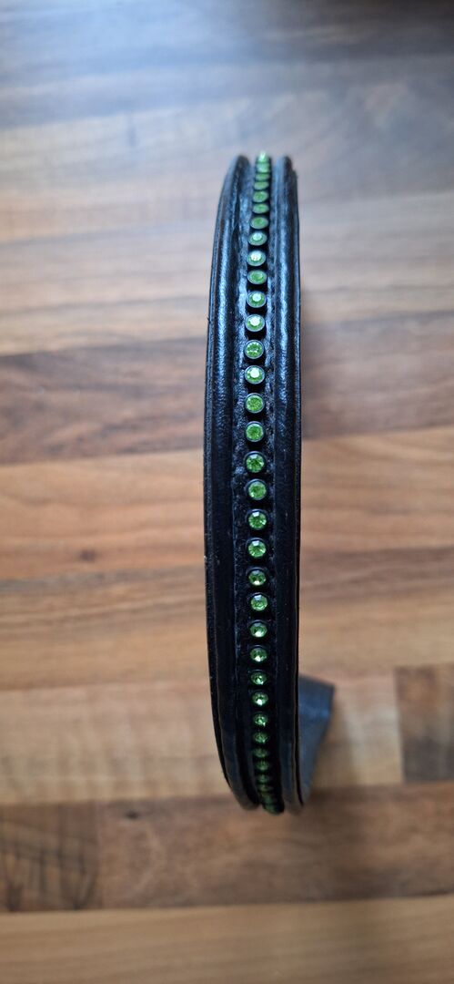 Voorhoofdsband met groene stenen - Zwarte wenkbrauwband met groene steentjes . Lengte 43 cm Breedte 1,5 cm