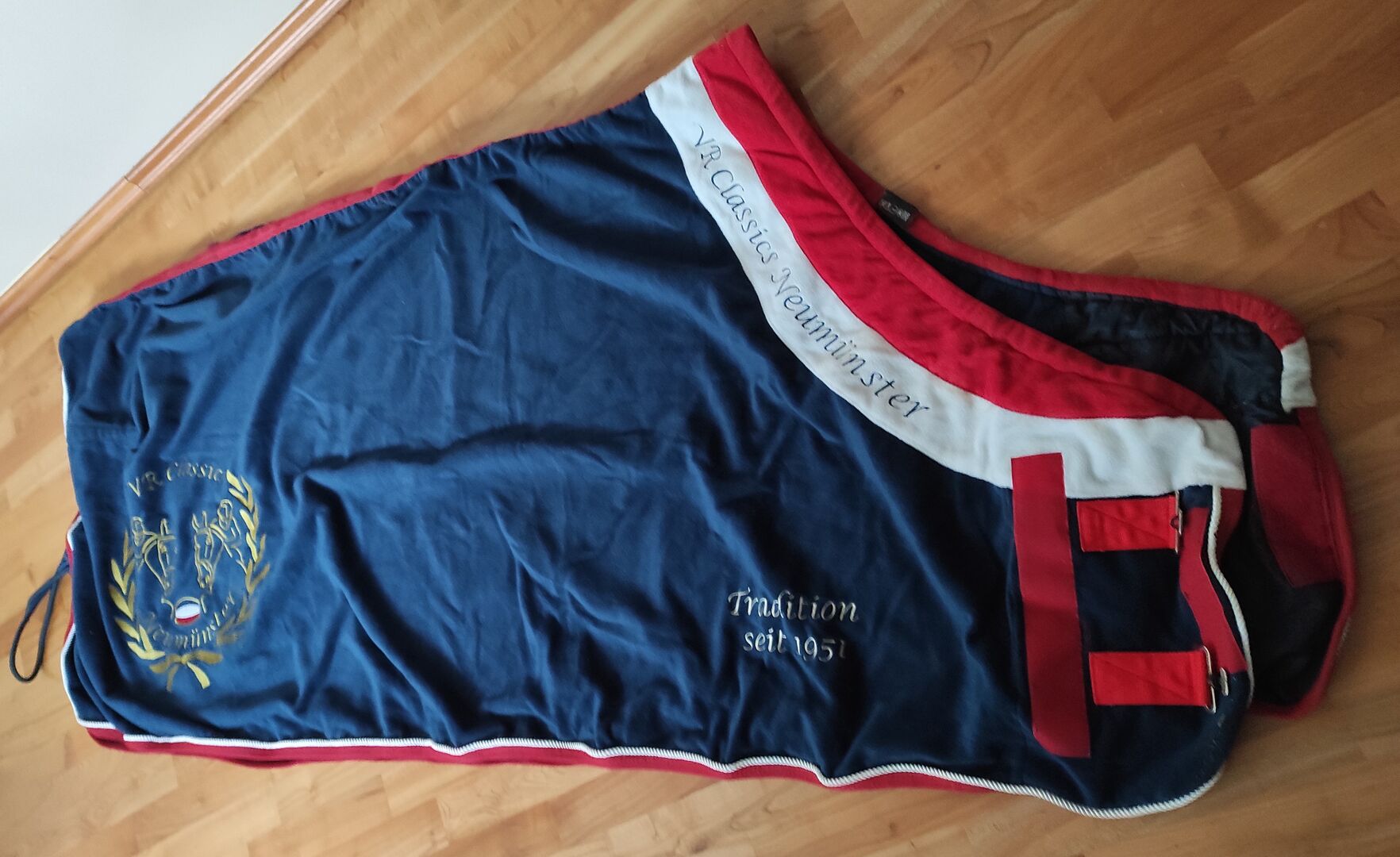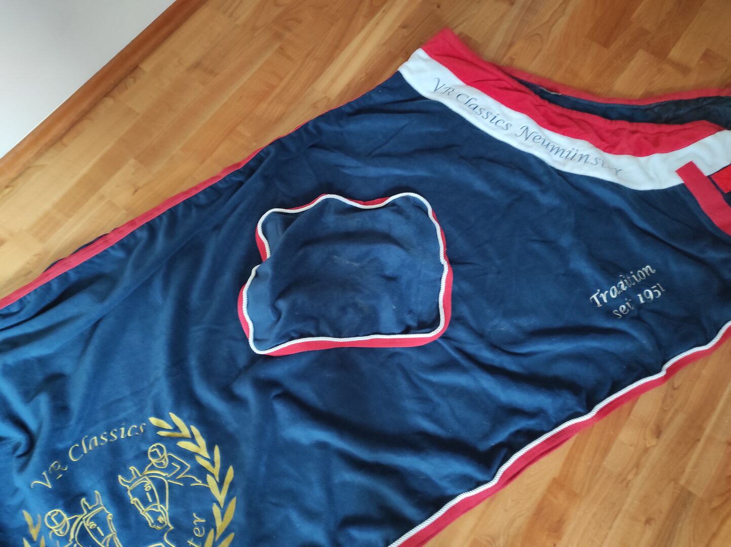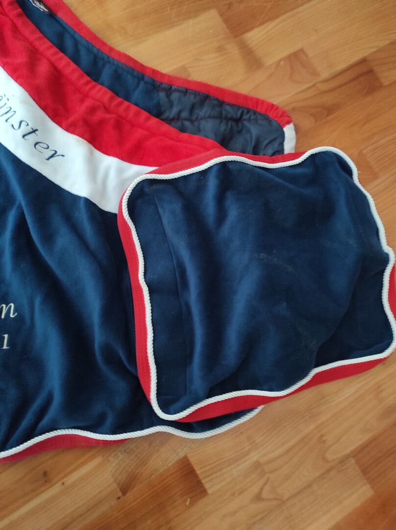 Dit unieke winnaarsdeken met afneembare slab is gemaakt van hoogwaardig materiaal (dikkere en goed zwemmende fleece stof) en is zeer stijlvol en chique afgewerkt. Het is uitgebreid geborduurd aan beide zijden en is in geen enkele ruitersportzaak te koop. Het is blauw en heeft een lengte van ongeveer 1,55. De deken is nieuw en is slechts twee keer op de rug van het paard geweest.