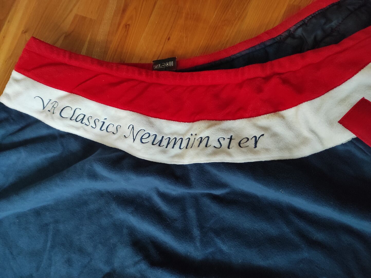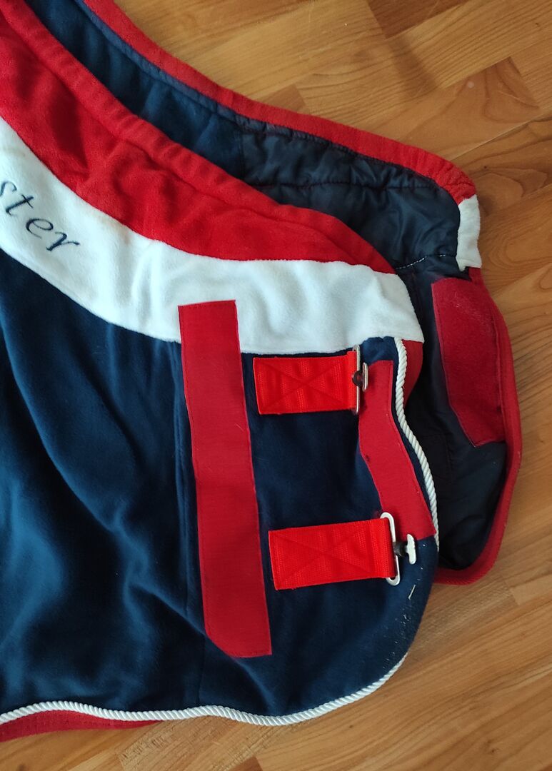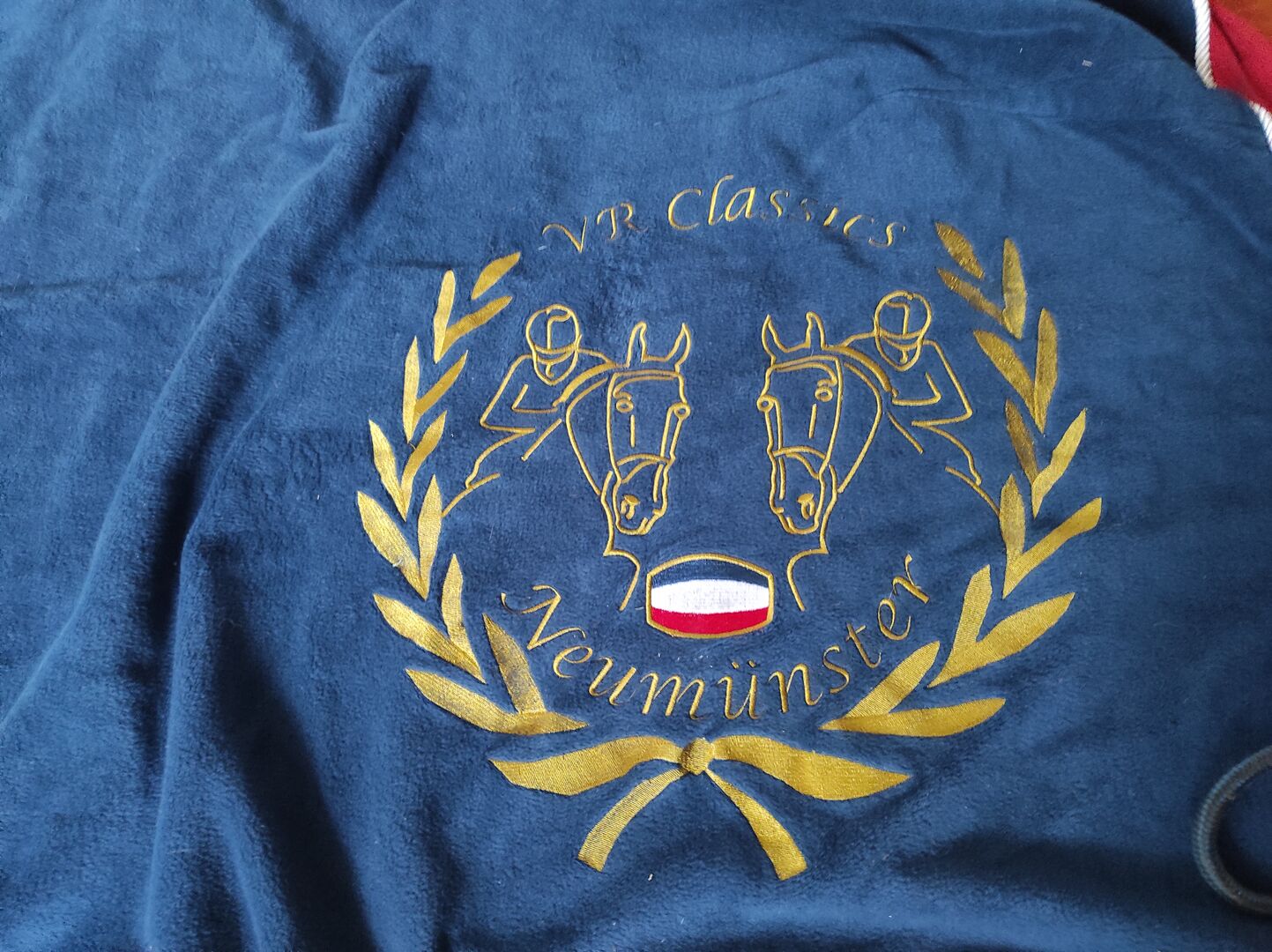 Dit unieke winnaarsdeken met afneembare slab is gemaakt van hoogwaardig materiaal (dikkere en goed zwemmende fleece stof) en is zeer stijlvol en chique afgewerkt. Het is uitgebreid geborduurd aan beide zijden en is in geen enkele ruitersportzaak te koop. Het is blauw en heeft een lengte van ongeveer 1,55. De deken is nieuw en is slechts twee keer op de rug van het paard geweest.