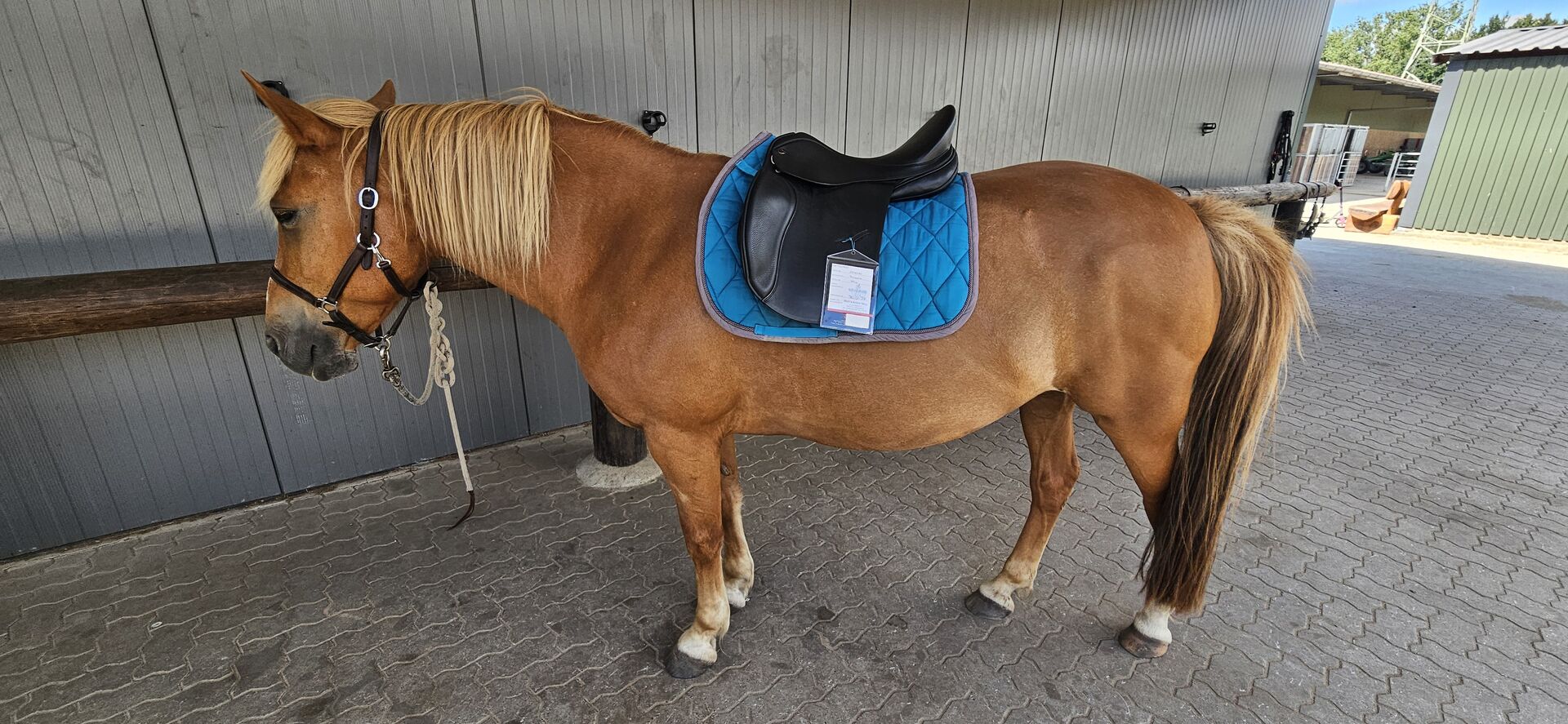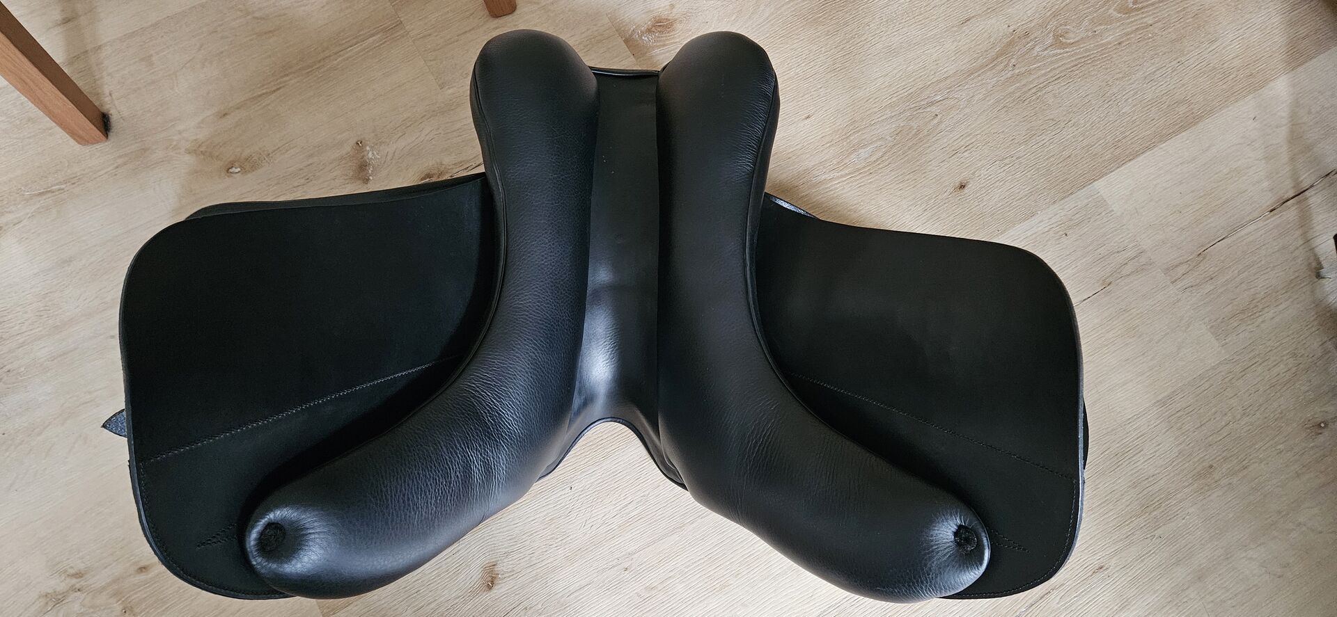 Ik heb het zadel nieuw gekocht en alleen heel weinig gebruikt omdat mijn paard vaak langere rustpauzes had vanwege rugproblemen. Ik ben 1 jaar geleden overgestapt op een barok zadel. Het was gemonteerd op een New-Forrest 1.42m.