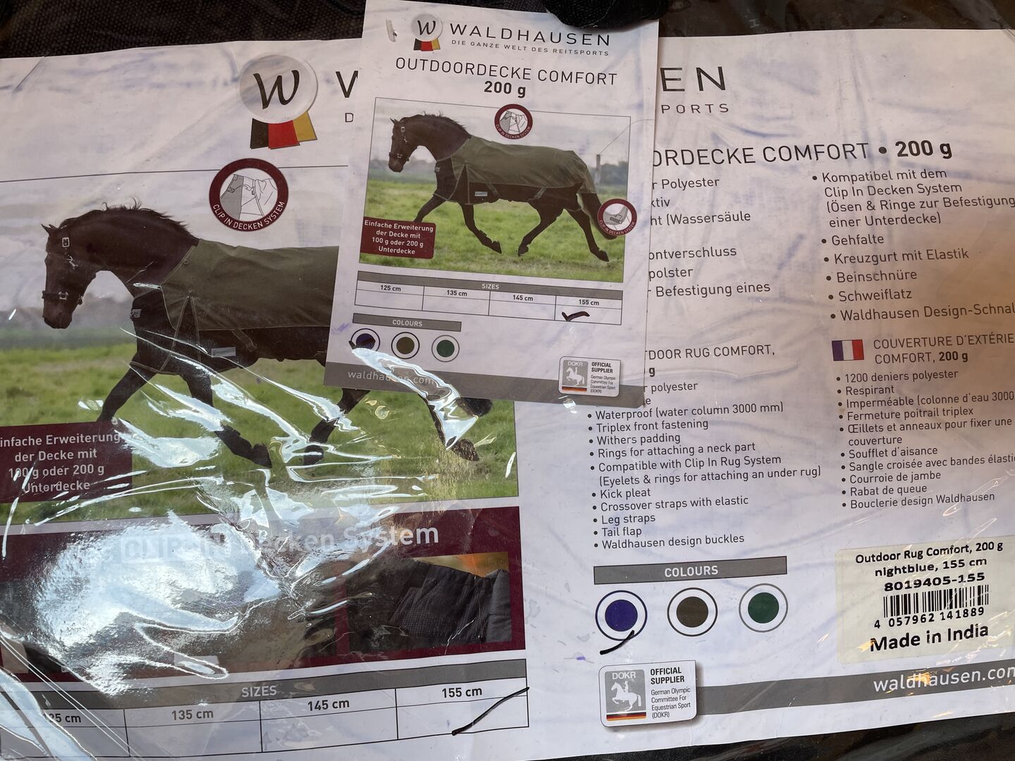Buitenmateriaal: 100% polyester (600 D) 200 g vulling Winddicht, waterdicht, ademend Plooien aan de voorkant Verstelbare Triplex voorsluiting Schoft pad Verstelbare kruissingels Verstelbare beenkoorden Staart slabbetje en staartkoord Ringen voor halsbevestiging Oogjes voor het bevestigen van een onderdeken Materiaal/functie