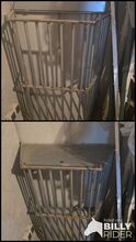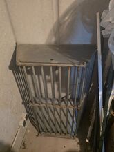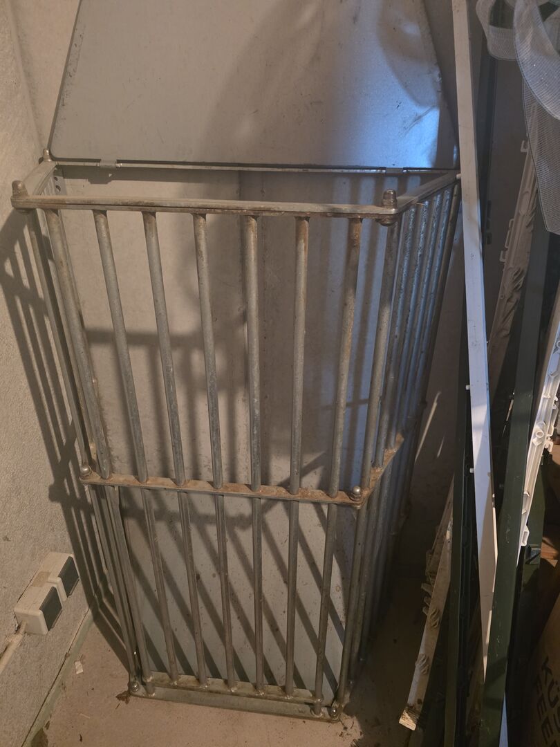 Bijzonderheid: Met scharnierend deksel voor eenvoudig vullen van bovenaf. De rekken zijn gebruikt, maar in zeer stabiele staat. Geen scherpe randen of doorroesten.