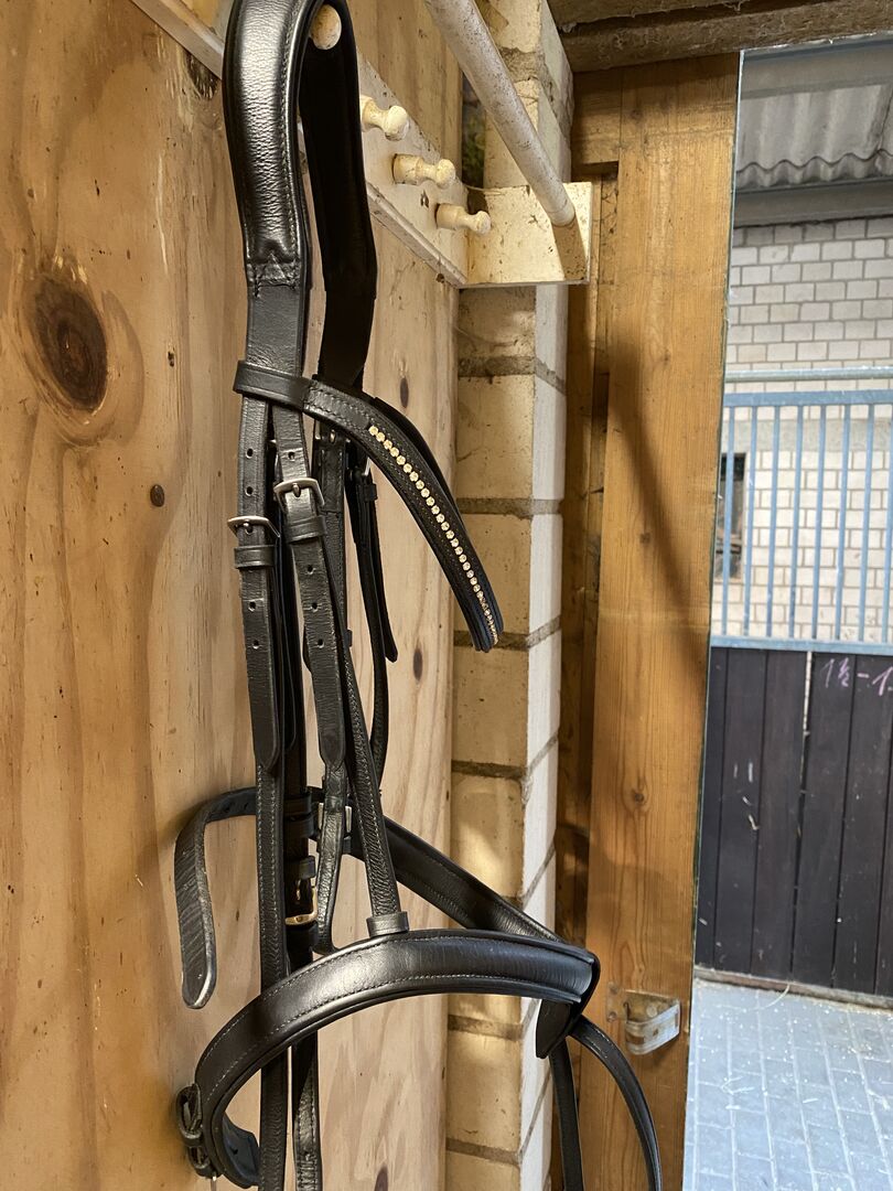 Warmbloed snaffel zwart - Ik verkoop mijn zwarte snaffle omdat hij te klein is voor mijn nieuwe paard. Het hoofdstel heeft een zeer net, zeer zacht leer, dat onmiddellijk aansluit op het hoofd van het paard. Het hoofdstel is anatomisch gevormd. Teugels zijn inbegrepen. De oorspronkelijke prijs was 90€.