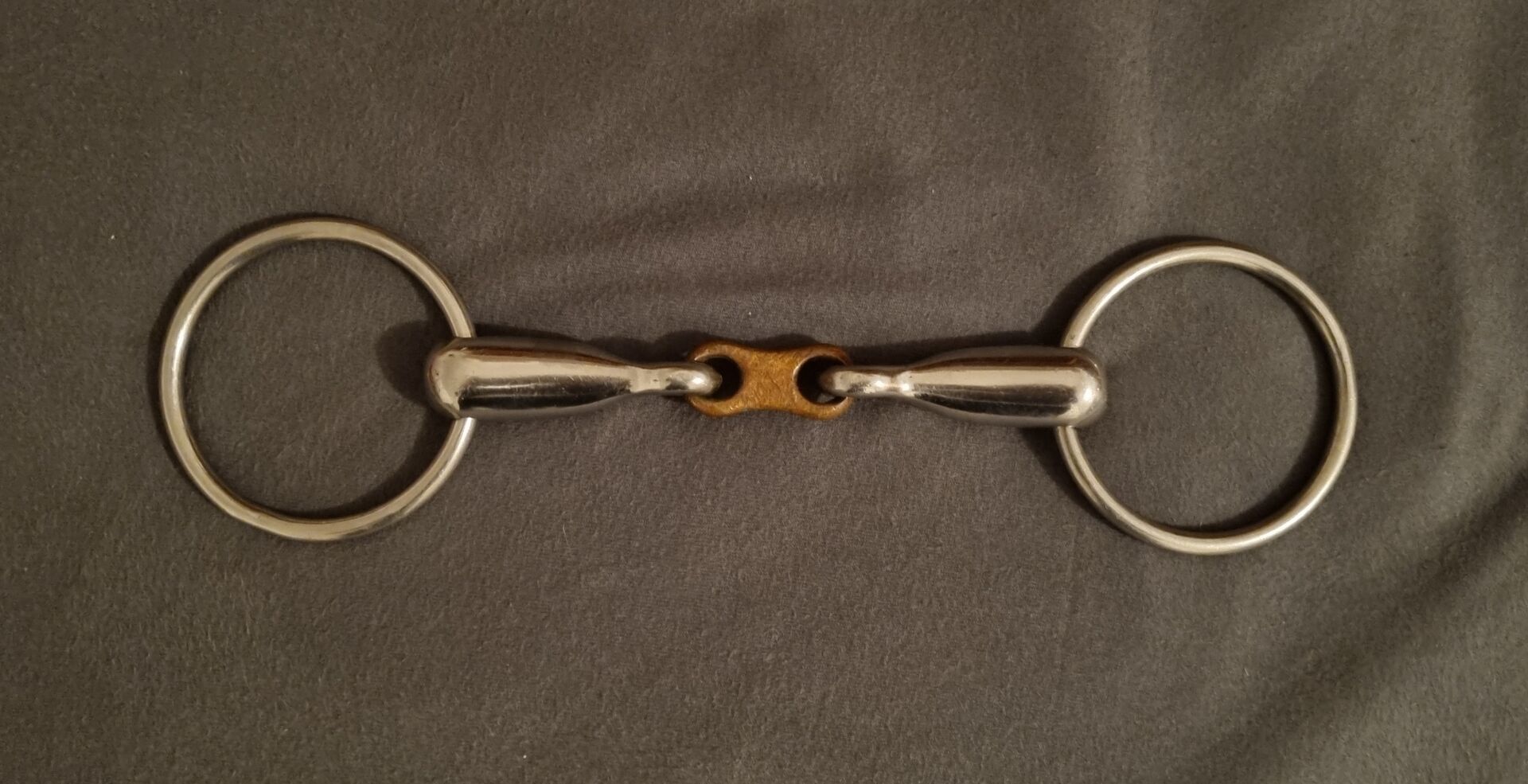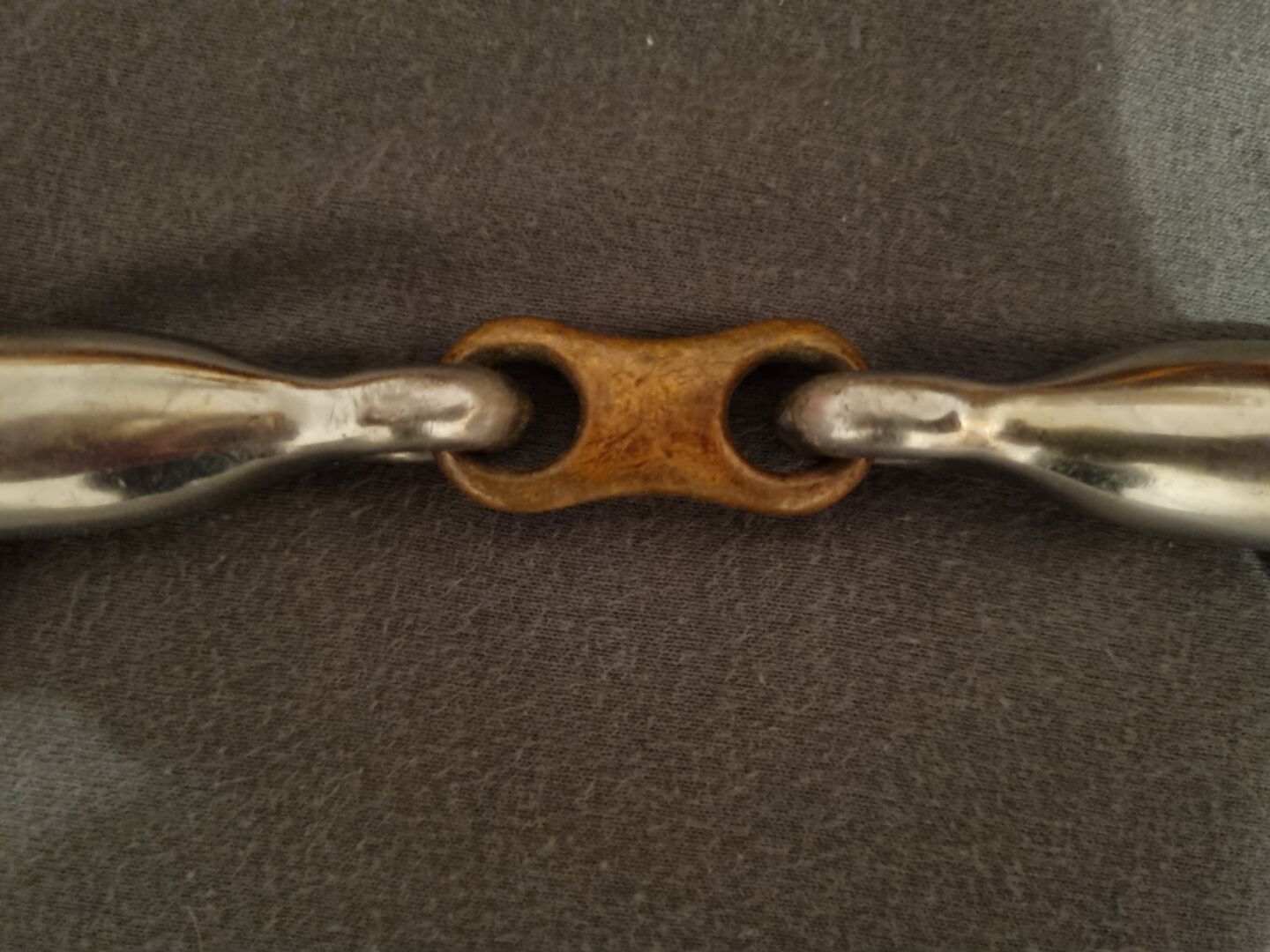 Watersnaar, bit, roestvrij staal-koper, dubbelgebroken, 14,0cm - Ik verkoop mijn dubbel bit watersnackle bit met een plat koperen middenstuk en roestvrijstalen ringen. Het bit heeft een lengte van 14,0 cm en een bitdikte van 16 mm. De ringdiameter aan de binnenkant is 67 mm.