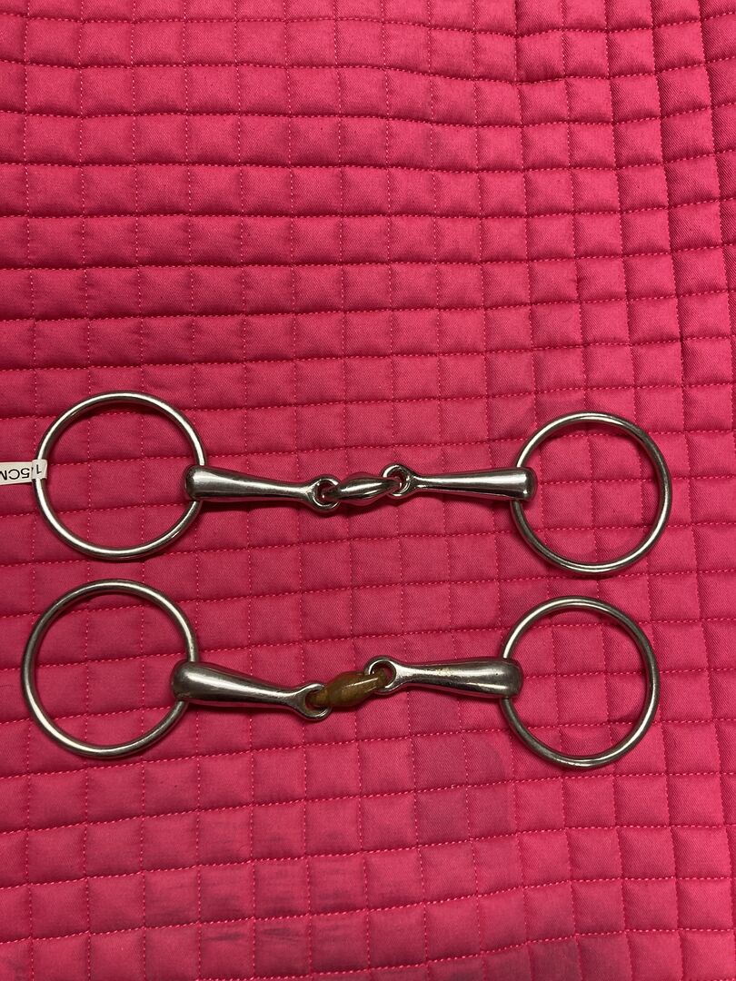 Watersnaar dubbel gebroken 14,5cm - Te koop dubbelgebroken water snaffels in maat 14.5cm. 1x met koperen middenstuk 1x normaal roestvrij staal voor 10€ per stuk Verzending wordt betaald door de koper.