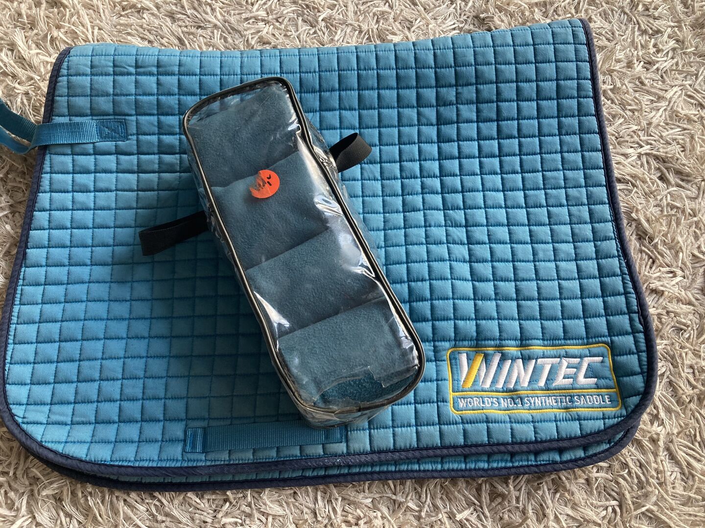 WB Wintec Zadeldekje Petrol - Aangeboden wordt een chique zadeldek in petrol. Het zadeldek heeft geen gebreken, alleen de kleur is een beetje vervaagd. Kan ook gekocht worden als set met de bandages in benzine.