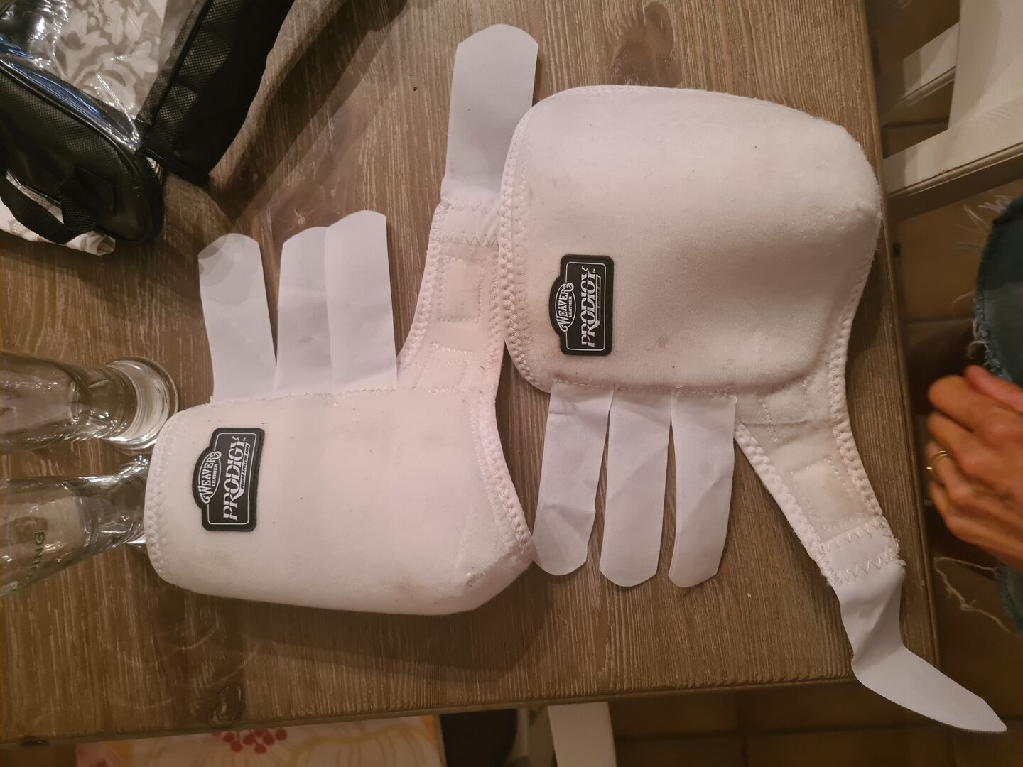 De beenkappen zijn maar 3 keer gebruikt, daarna waren ze te klein voor mijn merrie (in de groei). Helaas hebben we rood zand in de rondte, daarom zijn er minimale sporen op één gaiter. Maar ze zijn nauwelijks zichtbaar! De laarzen zijn pas gewassen. Gekocht in oktober '21 voor 85€ (zie foto's).