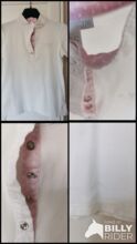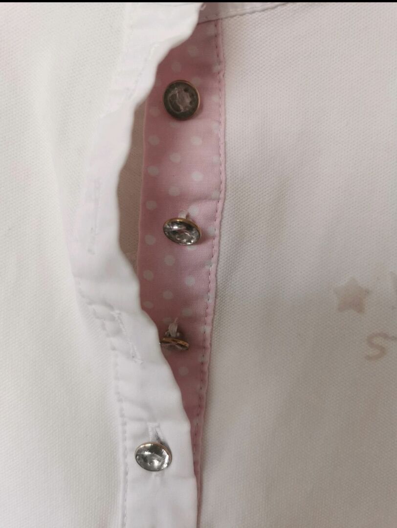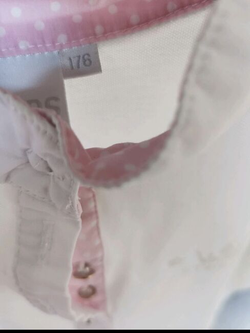 Wedstrijdblouse maat 176 - Hey, ik verkoop een wedstrijdblouse in de kleur wit met roze bies, het heeft ruitvormige knopen die perfect zijn voor meisjes die graag iets elegants en elegants dragen. De blouse is een paar keer gedragen maar is nog in zeer goede staat. Helaas zit er een heel klein vlekje op de achterkant dat er niet meer uit gaat, maar je ziet het bijna niet als je het draagt. Maar omdat kinderen toch snel uit hun kleren groeien, is dit een heel chique overgangsblouse.