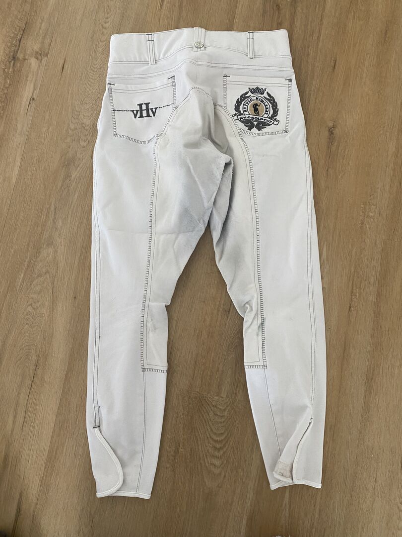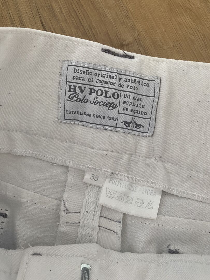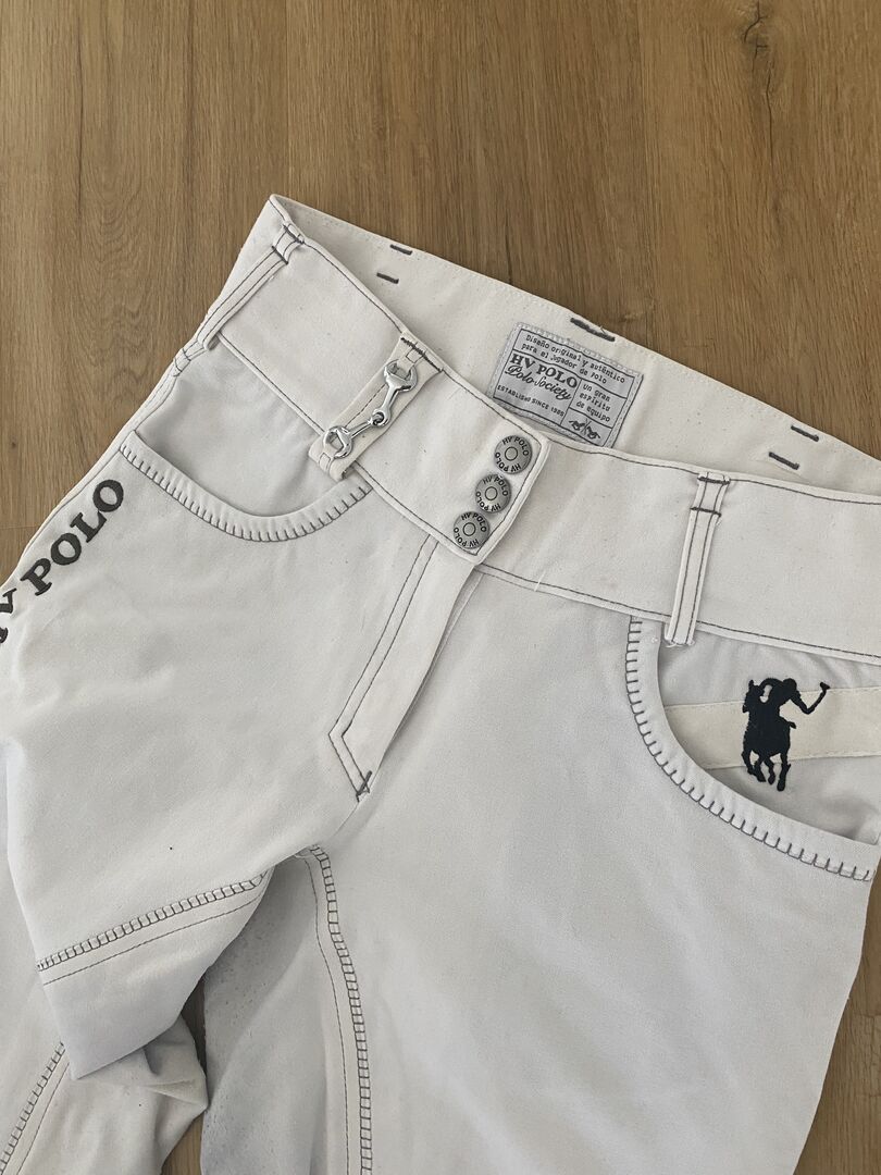 Wedstrijdbroek HV Polo vol zitvlak - Ik verkoop mijn witte wedstrijdbroek van HV Polo in maat 38. De broek heeft prachtige details aan de voor- en achterkant (zie foto's!). U kunt de gebruikssporen zien op de volle zitting aan de achterkant, die helaas niet wegblijven. Maar je kunt ze niet zien als je op het paard zit.