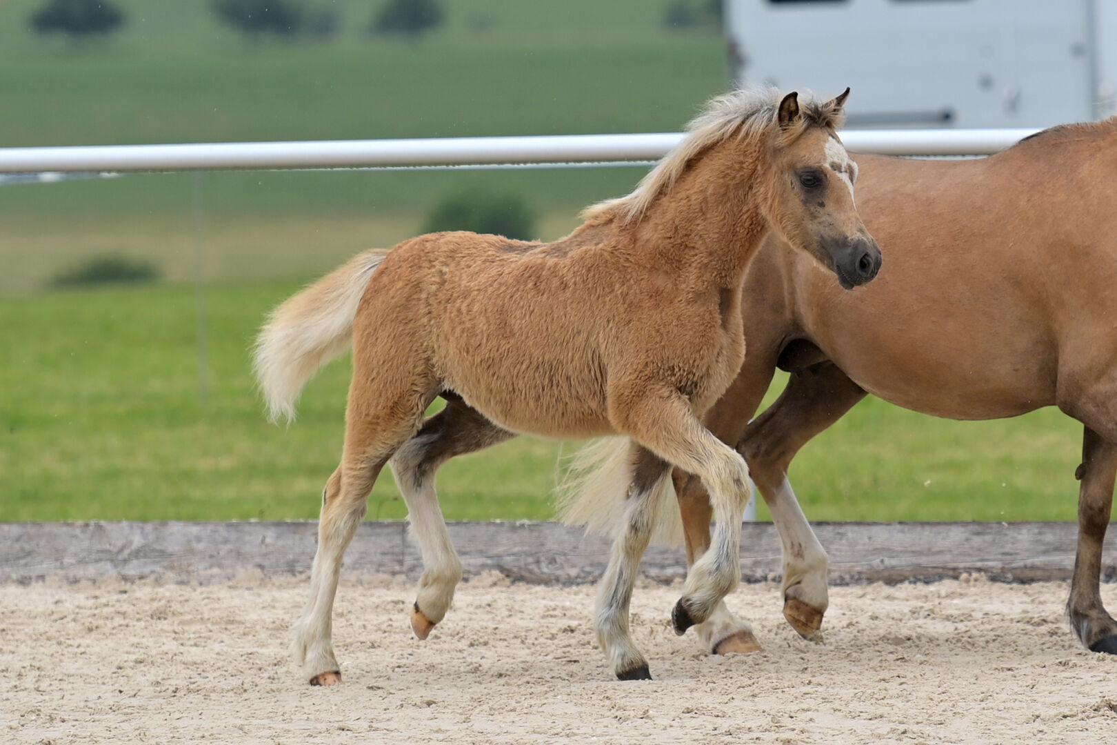 Welsh A merrieveulen - Te koop is een zeer mensgericht en typevol Welsh A merrieveulen in de populaire palomino kleur. Het veulen heeft ook een opvallende bles en een blauw oog. Het veulen is geboren in februari en mag na het spenen eind augustus naar buiten. De vader en nakomelingen van vorig jaar zijn ter plaatse te bezichtigen.