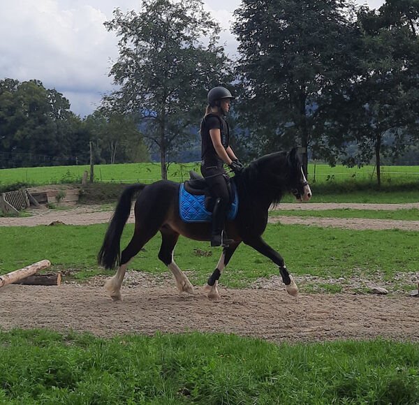Welsh Cob sectie C, hengst, 19 jaar oud, zwartbruin met vier witte voeten, 1,34m Stm.