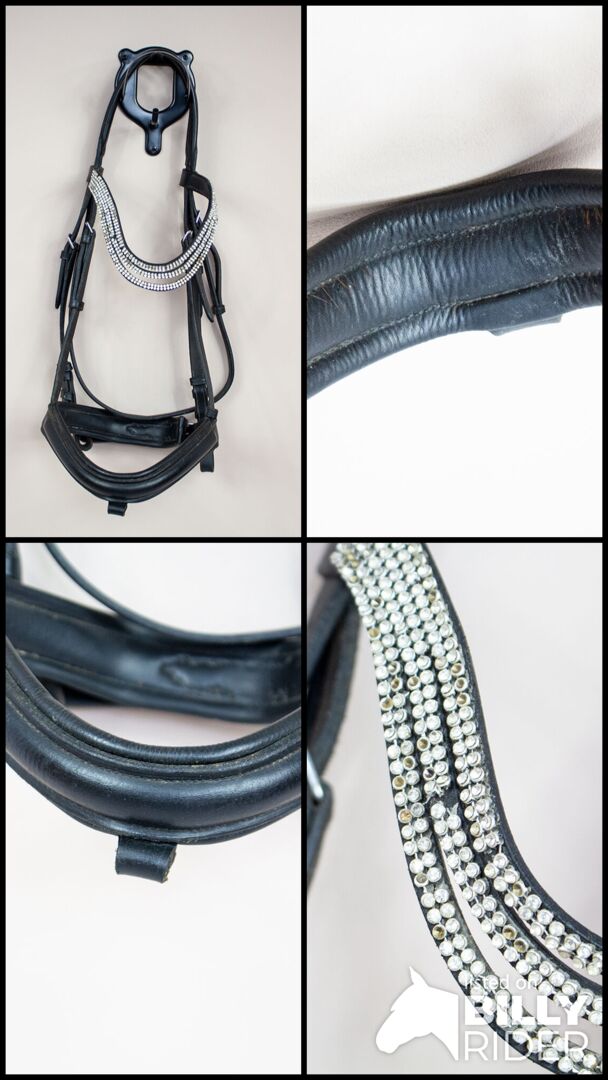 WEMBLEY Snaffle zwart VB - Deze mooie zwarte Engelse gecombineerde snaffle van Wembley is de perfecte dagelijkse metgezel. Het is een volbloed maat en gemaakt van leer. Het hoofdstel is extra zacht en heeft een gewatteerd nekstuk. Hij heeft ook een gevoerde neusriem en is over het algemeen zacht opgevuld. De gespen zijn van zilver en de snaffle heeft een ongebruikelijke drie-rijige wenkbrauwband met kleine witte glinsterende steentjes. Dit is ook van Wembley. Het hoofdstel heeft slechts lichte gebruikssporen en is in zeer goede staat. Helaas ontbreken enkele steentjes van de wenkbrauwband. Deze kan echter gemakkelijk worden vervangen. To the seller's offerlaunch