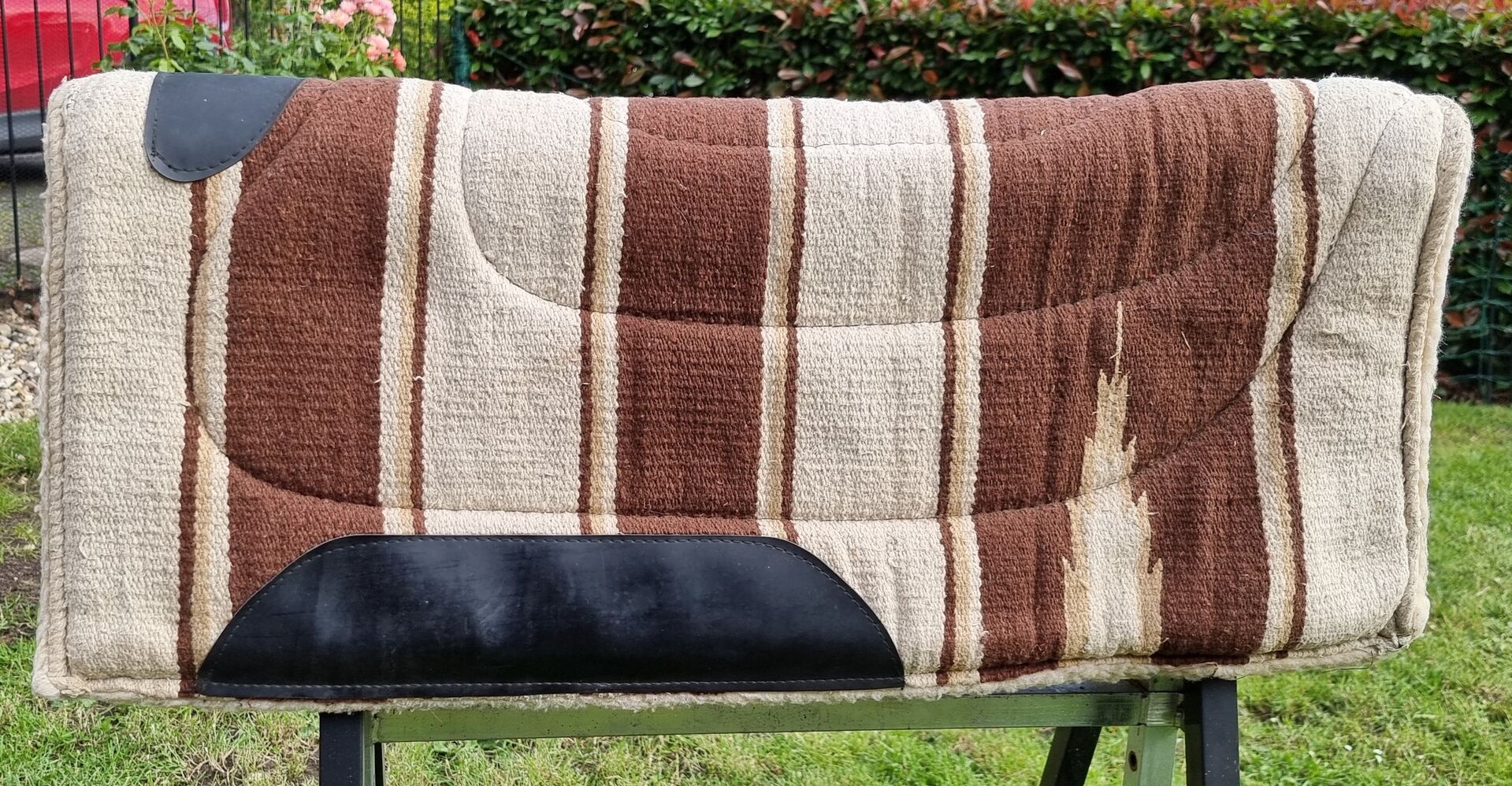 De onderlegger is tweedehands gekocht, dus ik kan helaas weinig details geven. De onderlegger heeft maar een paar keer zonder zadel op het paard gelegen toen een kind wilde rijden. De onderlegger is regelmatig onderhouden en schoongemaakt.