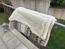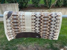 Western pad Classic Equine Sensorflex - Nieuw westernkussen 81x86cm in crème/bruin, uitsparing voor spatbordpositie, recht afgesneden aan de achterkant, gekocht voor kleinere QH, heeft nooit op het paard gelegen, dus nieuw, nieuwprijs was ongeveer 130€.