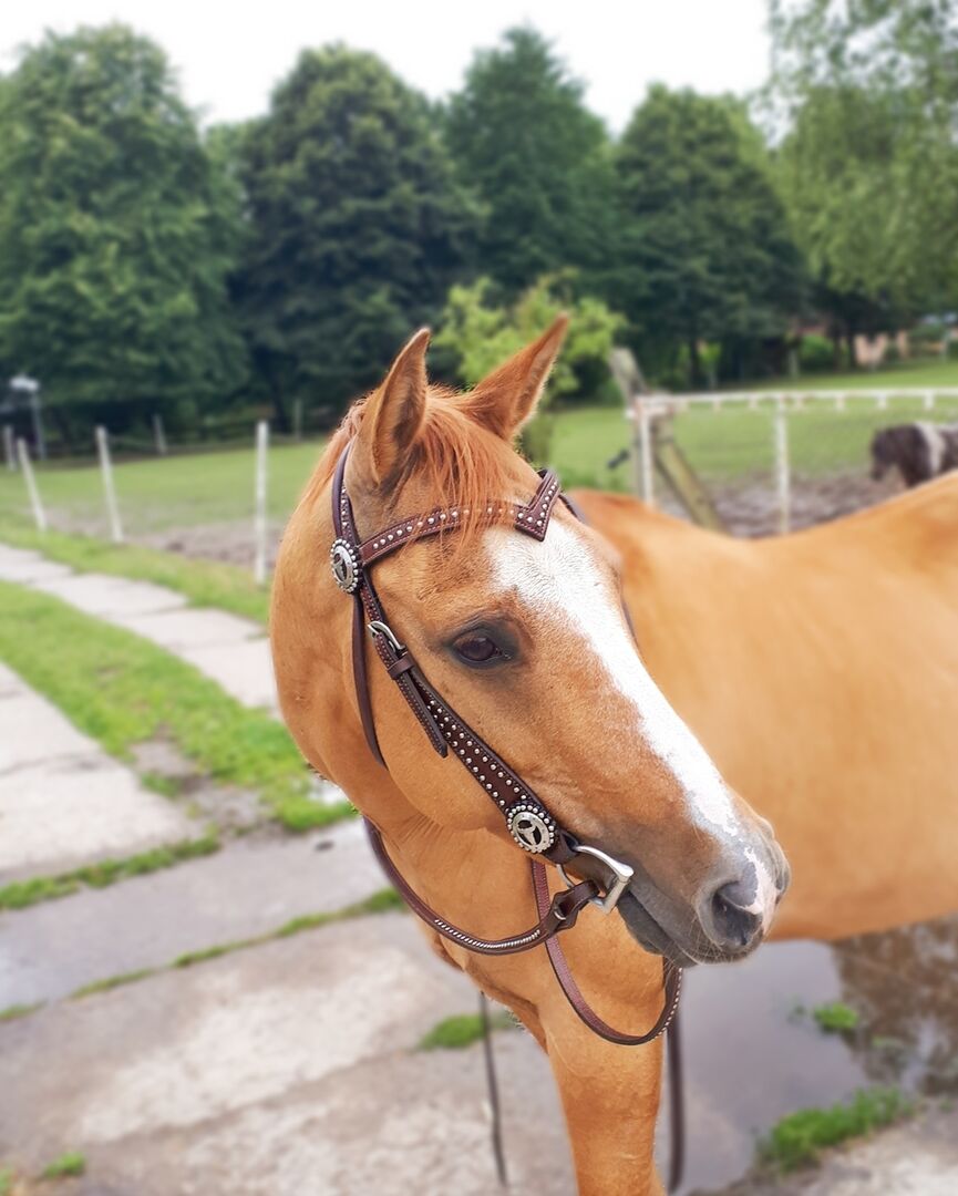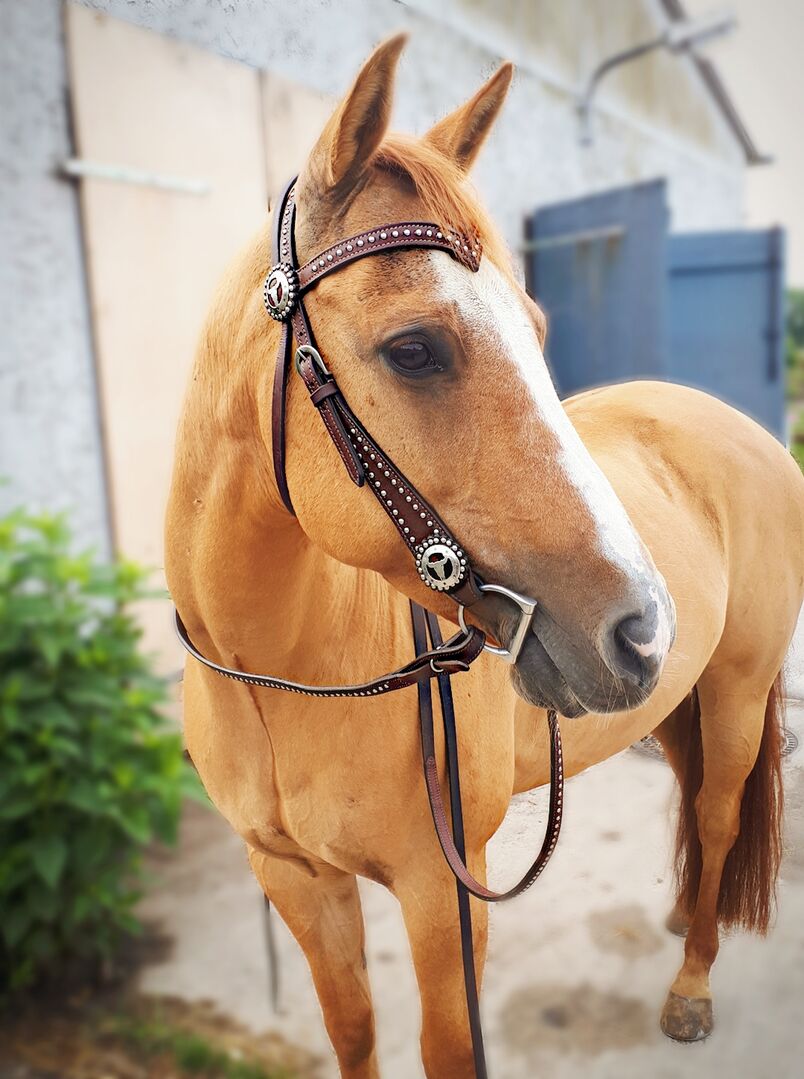 Western show snaffle - Ik verkoop een western show snaffle met de bijbehorende teugels. Helaas hangt het gewoon bij mor, omdat ik van western naar Engels rijden ben overgestapt. Hij is niet veel gebruikt en is nog in goede staat. De aankoopprijs was ongeveer 70€.