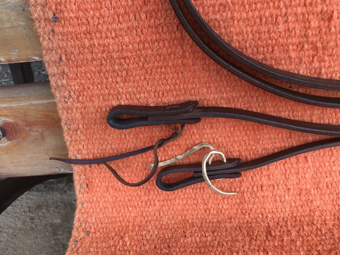 Western show snaffle donkerbruin - Ik bied hier een prachtige show snaffle aan met gevlochten rawhide lagen in een mooie contrasterende kleur. Inbegrepen zijn 2.70m Lande Split teugels ook met gevlochten rawhide. De conditie is zeer goed. De snaffle is slechts een paar keer gebruikt op shows. Het leer is dik en van hoge kwaliteit. Het hoofdstel zit erg goed op het hoofd van het paard. Er is de mogelijkheid om kwastjes aan de voorkant van de frontriem te bevestigen.