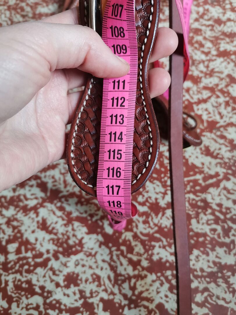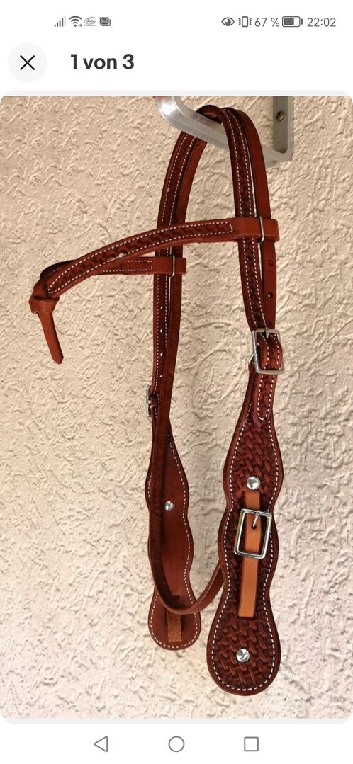 Western Snaffle - WB / Full - bruine mand - Bieden een nauwelijks gebruikte en dus als nieuwe western snaffle / headstall. > Western Imports > Western Snaffle California Style > Basket stamping > Gebreide frontriem > Bitbevestiging door middel van een schroef > Maat WB / Full > Materiaal tuigleer > Kleur naturel Maximaal instelbare lengte vanaf de bithouder links - over de nek - tot de bithouder rechts: ca. 116 cm