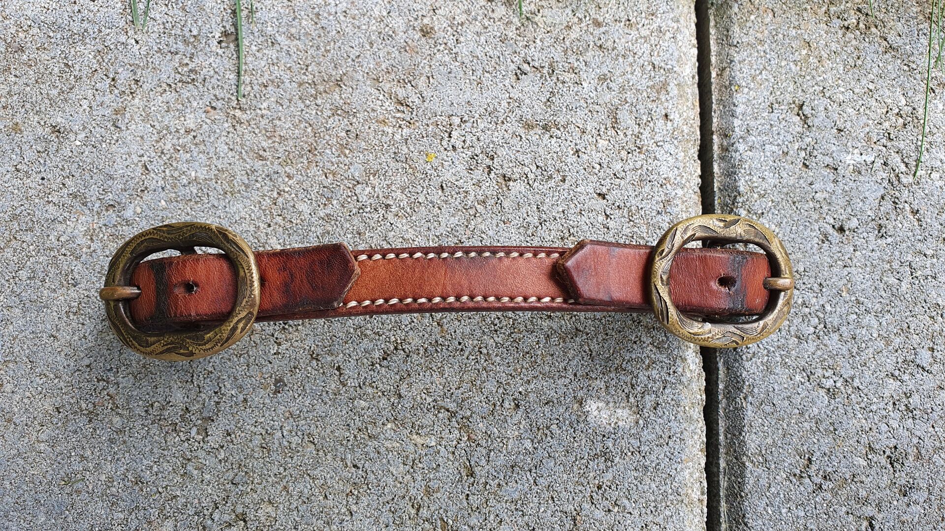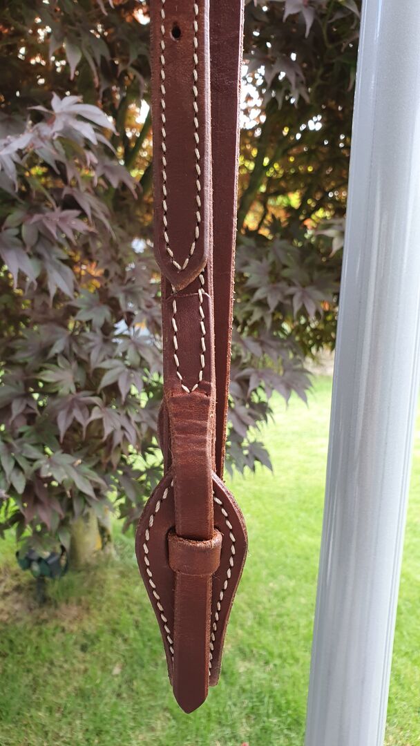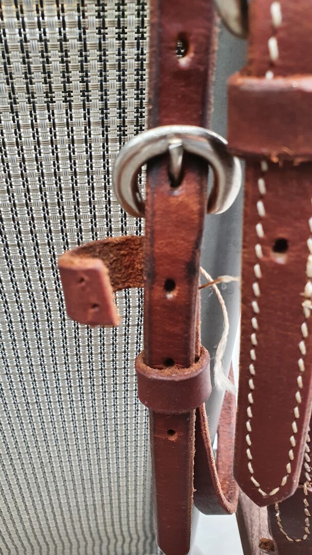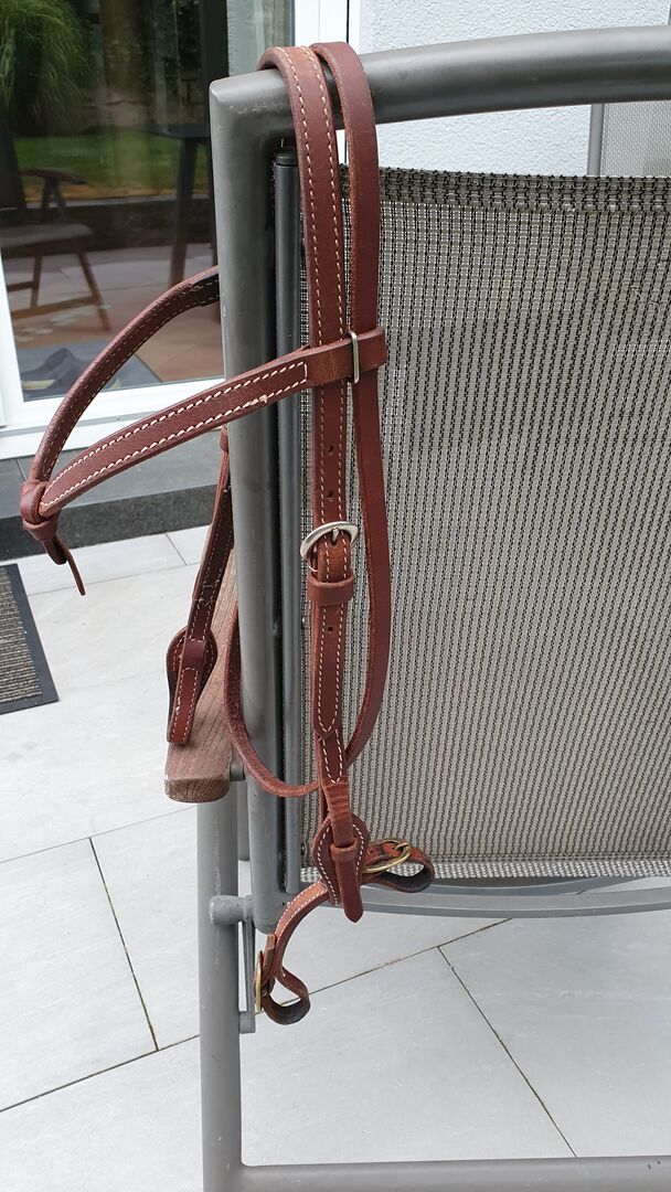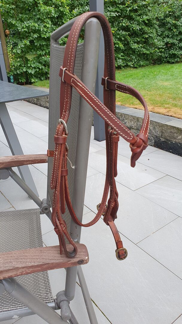 Western trens met knoop incl. kinriem / vers gereinigd + ingevet / - Geknoopt hoofdstel, zwaar leer, eigenlijk in zeer goede staat ! een kleine naad is uitgerafeld (2 steken) op een niet-dragend punt (zie foto). bijpassende kinband, allemaal schoongemaakt en ingevet. Je bent welkom om me een realistisch bod te doen !
