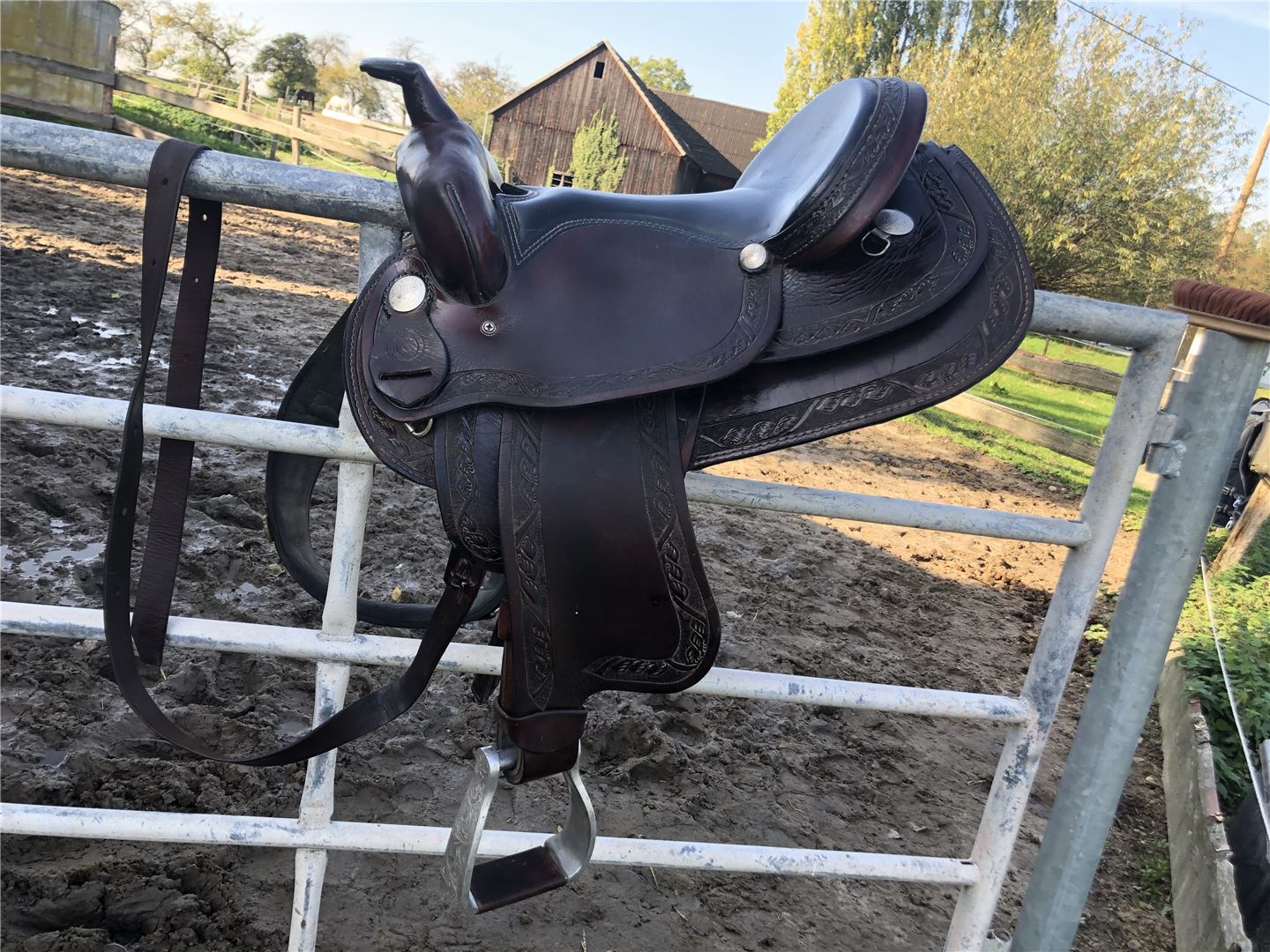 Western zadel - Ik verkoop mijn gebruikte Continental western zadel. Het zadel is gebruikt en vertoont de gebruikelijke tekenen van gebruik. De choncha-afstand is ongeveer 23 cm en de lengte is 62 cm, de zitting is 16". Het zadel heeft weinig schommel. Stropdasriem en uit-billet zijn aanwezig. De stijgbeugels zijn van metaal. Aangezien de datum een plastic zadelboom heeft, is hij vrij licht.