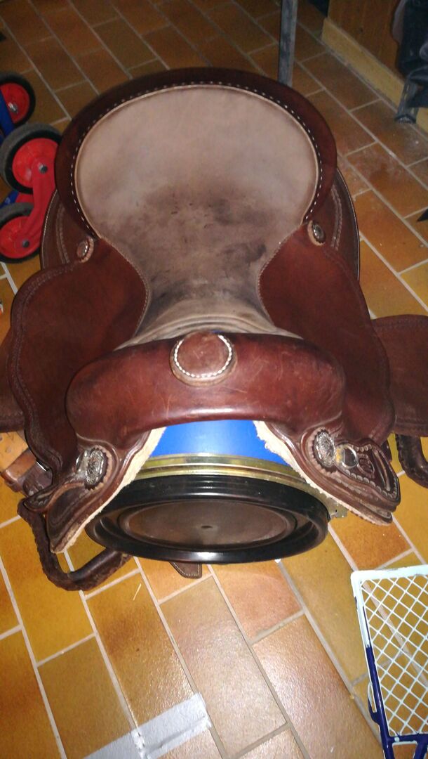 Western zadel - Liggend op een Poolse sterke wb met weinig wreef, vrij korte rug en lichte zwaai. Normale tekenen van gebruik. Ik kocht hem tweedehands van een zadelmaker voor 950€ en heb er maar 5 keer op gezeten omdat het paard niet meer te berijden was. Het zitvlak van 16 cm paste me heel goed met een kledingmaat 44. Het is ook zeer comfortabel. Helaas, het past niet bij mijn huidige paard. Op de foto's lijkt de zitting bevlekt. Maar zo is het niet echt. De lengte is 66cm, de breedte is 18cm en de onderkant is 42cm.