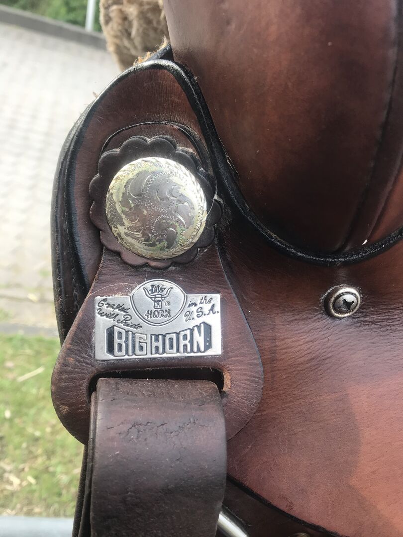Western zadel - Hallo, Ik verkoop mijn Bighorn western zadel. De zitting is 15 inch. Het zadel heeft een honingkleurig verdonkerd leder, met bloemmotieven en 6 zilveren conchas. De zitting is van nubuckleer. Het heeft een van rawhide gevlochten hoorn met zilveren conchas, een latigo off-billettes bindriem en rawhide stijgbeugels.