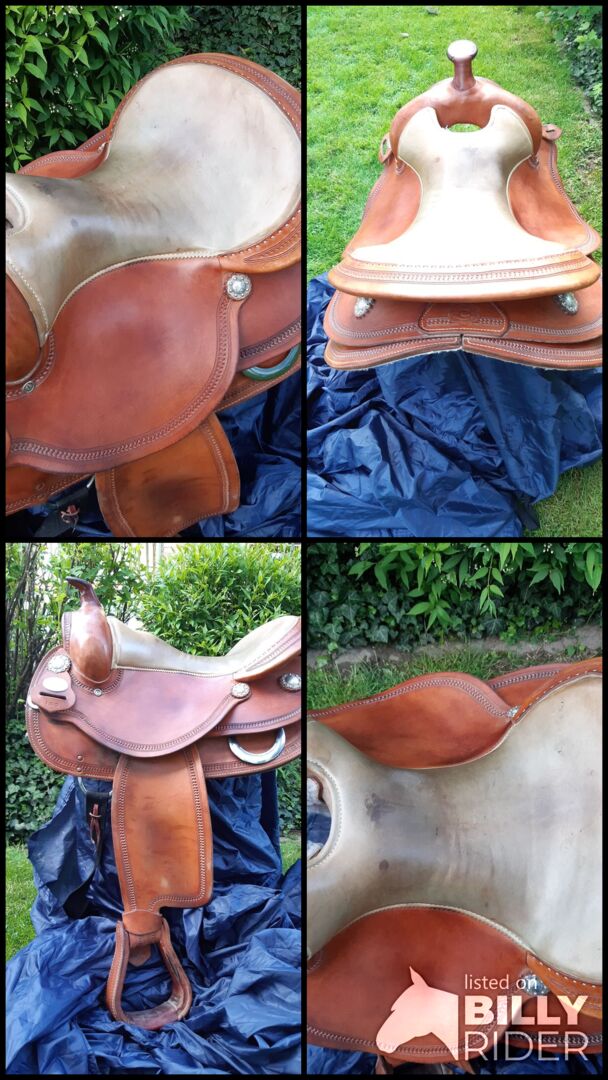 Western zadel - Mooi lichtbruin westernzadel met lichtgekleurde zit. Het zadel is versierd met keurmerken en beslag. Het wordt verkocht met singel. Het zadel zal waarschijnlijk passen op een sterker warmbloed of een smal koudbloed. Het zadel werd gebruikt gekocht in 2018