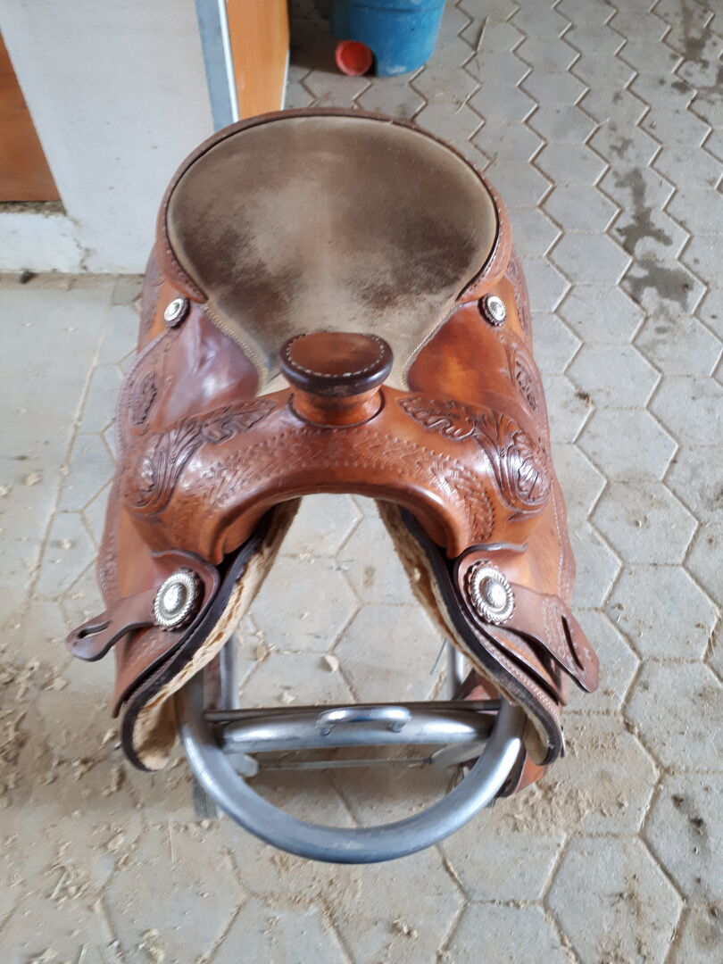 Western zadel - Goed gebruikt maar goed onderhouden westernzadel van Cayuse Custom Brand Saddlery. Volledige kwart boom (gemiddelde slokdarm breedte) Zitmaat 16". Totale lengte ca. 67cm. Verzending mogelijk tegen kostprijs.