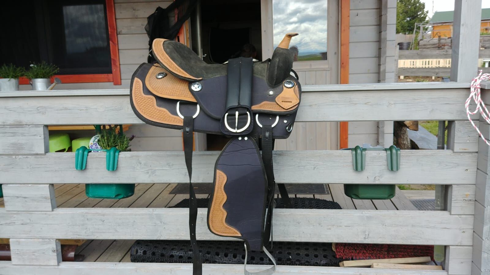 Western zadel - Zadel, kleur: Zwart/Bruin, wordt verkocht inclusief korte singel & stijgbeugels (zie foto). Onderkant opgevuld met wit bont. Neem contact met mij op als u nog vragen heeft.