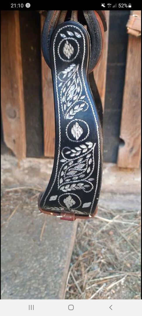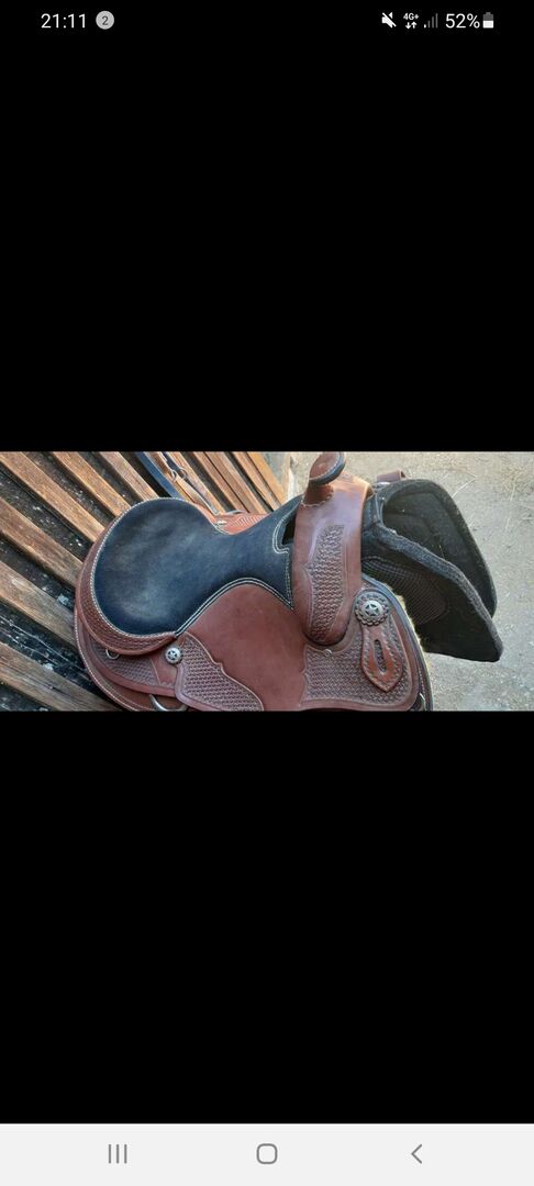 Western zadel - Nieuw western zadel, slechts 3 keer op gezeten. Zeer comfortabel, paard voelt zich er niet goed bij. Ook inbegrepen zijn hoofdstel (teugels + bit met schachten 13.5cm), vilten western pad, 2x singel, 1 paar sporen!