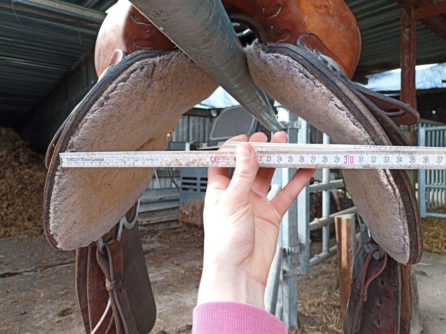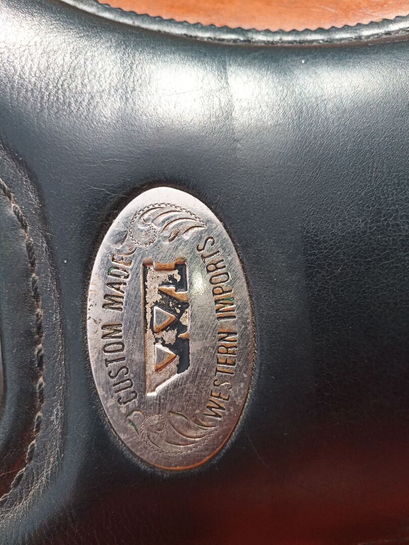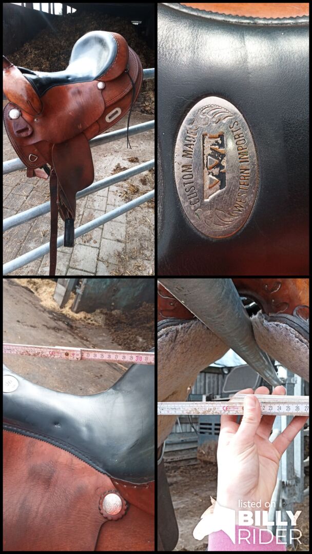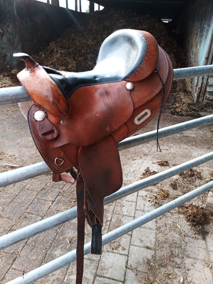 Western zadel - Rondzadel met houten boom. Zat op mijn Fries. Goed onderhouden, maar met overeenkomstige gebruikssporen. Leeftijd is onbekend. Zwarte stalen stijgbeugels zijn inbegrepen