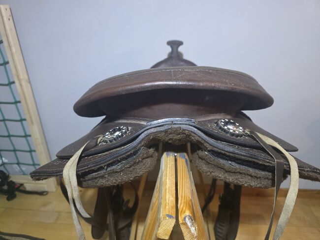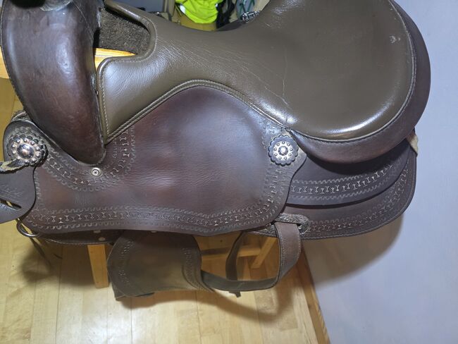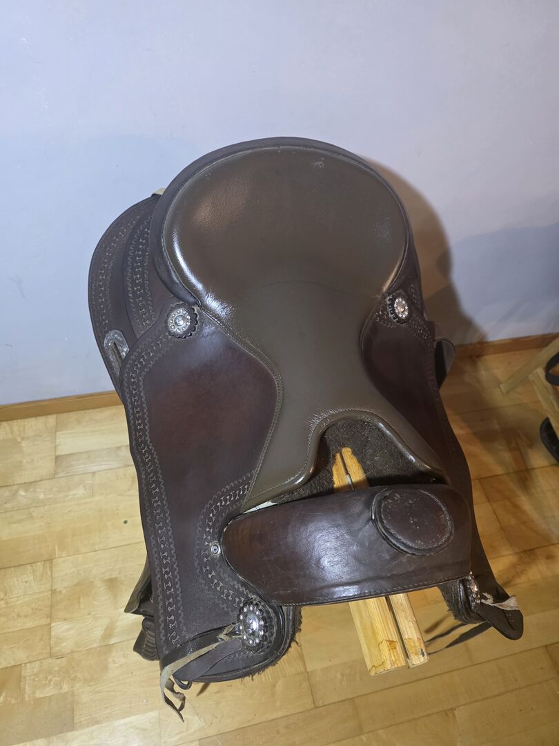 Speciale kenmerken & afmetingen: Zitmaat: 17 inch Totale lengte: ca. 65 cm Uiterlijk: Donkerbruin kwaliteitsleer met mooie gestanste randen en zilveren conchos. Conditie: Gebruikt, maar in zeer goede staat (zie foto's). Het leer is zacht en de bekleding is intact.