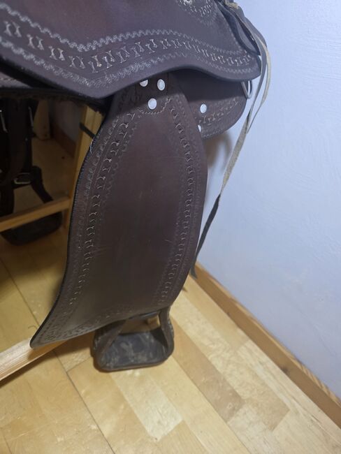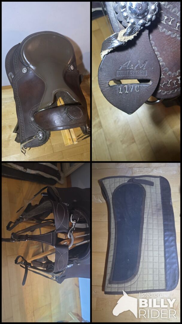 Western zadel A&M Reitsport 1170 | 17" zitvlak | complete set - Ik verkoop mijn goed onderhouden A&M Reitsport westernzadel (model 1170). Het zadel is ideaal voor ruiters die op zoek zijn naar een groter zitvlak en is ook geschikt voor paarden met een niet al te lange rug.