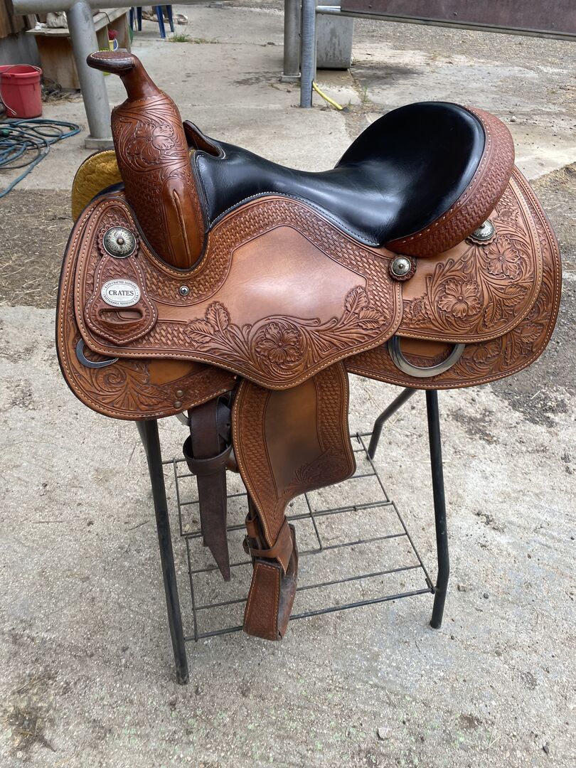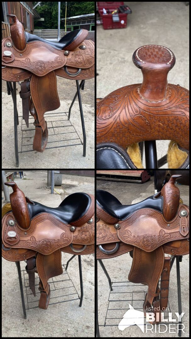 Western Zadel Dames Reiner Kisten 4517 - Gebruikt Crates 4517 western zadel. Dames Reiner, speciaal gemaakt voor vrouwen. 16 inch zitting. Helaas heeft mijn paard spiermassa opgebouwd en nu past dit geweldige zadel niet meer. Mijn persoonlijke favoriete zadel! Absoluut top voor vrouwen. NP 3495,-. Zie foto's. TEL. 0175-5646092