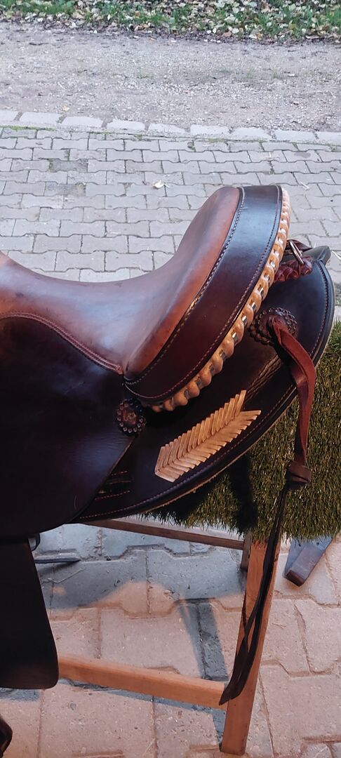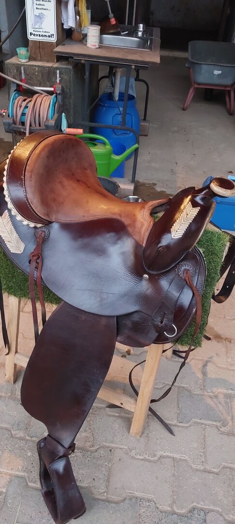 Western zadel inclusief onderlegger en singel - Het zadel is in goede staat met normale gebruikssporen. Kamerbreedte 1, Roundskrit. Daarnaast een bijpassend wolviltkussen van CSF, zo goed als nieuw en een 32 mohair singel van Mustang ook zo goed als nieuw.