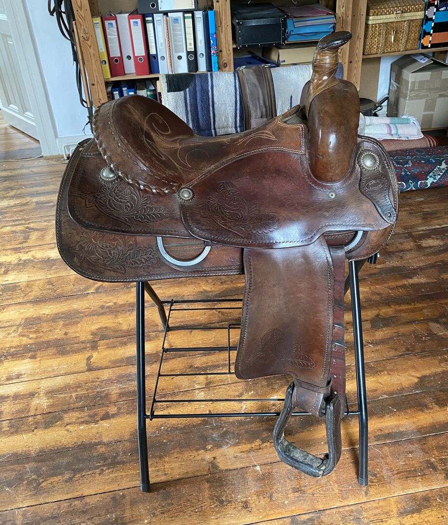 Western zadel Santa Fe - Wegens pensionering: Geweldig ouder westernzadel met silverlace cantle (rugleuning) en subtiele versieringen. Het zadel heeft een diepe, stevige zit en werd vaak gebruikt voor het inrijden van jonge paarden (kwartieren).