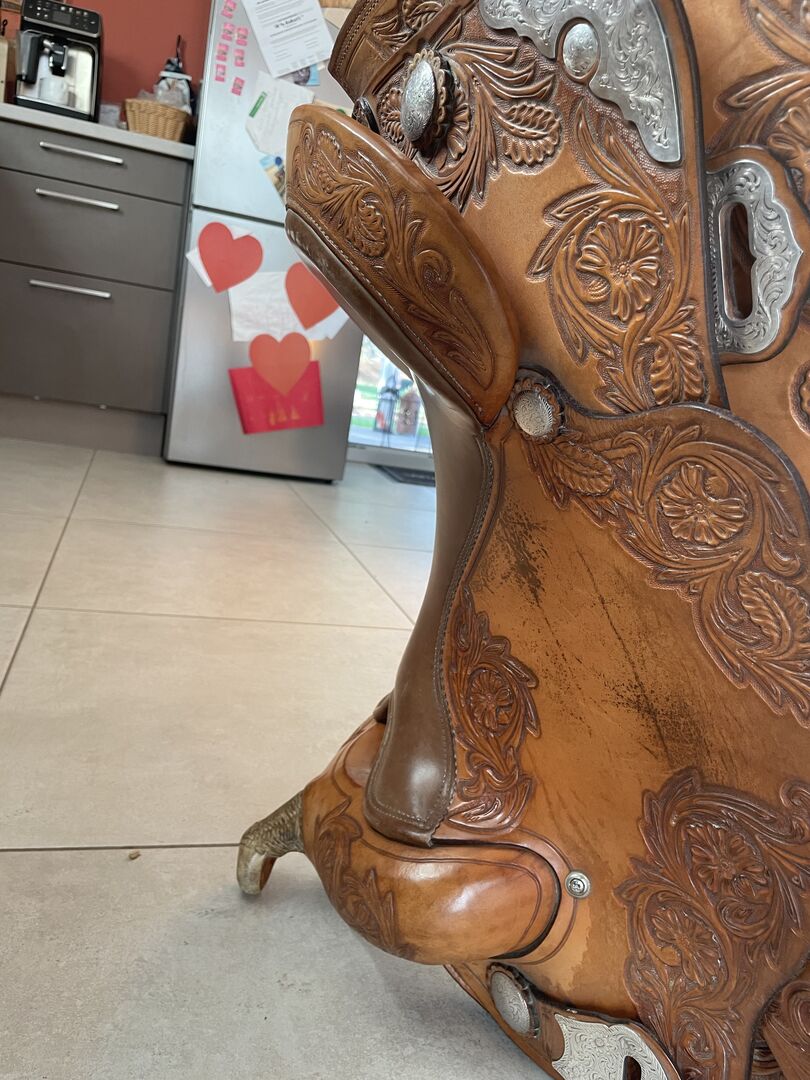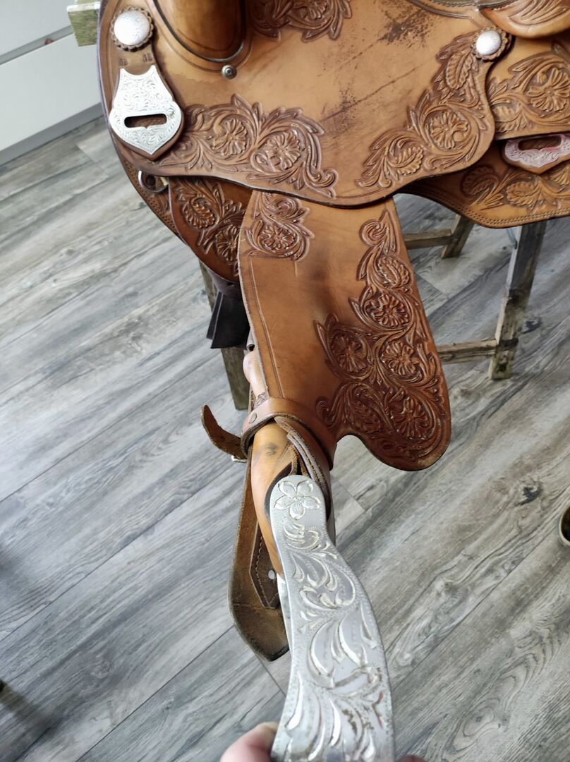 Western Zadel Show Zadel 16" - Gebruikt showzadel, compleet met bindriem, uit billet en gegraveerde aluminium stijgbeugels. Het was gemonteerd op een groot Quarter Horse met een gemiddelde swing, iets bredere schouder en gemiddelde schoft. Helaas heb ik geen merknaam op het zadel kunnen vinden, maar het was mij door een dealer verkocht als een Deuber.