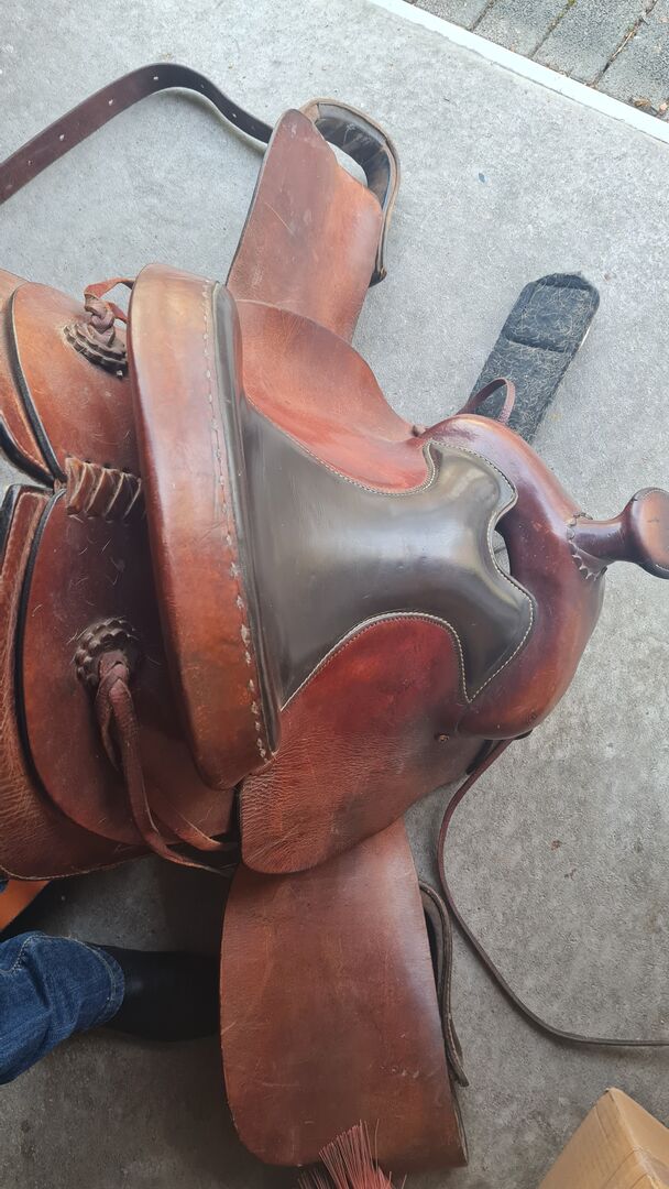 Western zadel van Big Horn gebruikt te koop - Verkoop mijn grote westernzadel van Big Horn dat in goede staat is. Houten boom met lichte schommel. Rookvrij huishouden. Droog opgeslagen. Inclusief viltkussen. Leer in goede staat. Slechts enkele tekenen van gebruik. Is gebruikt op een breder eindmassapaard.