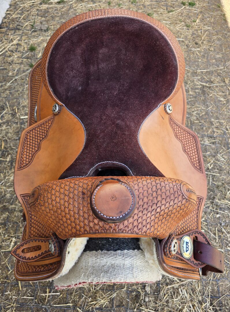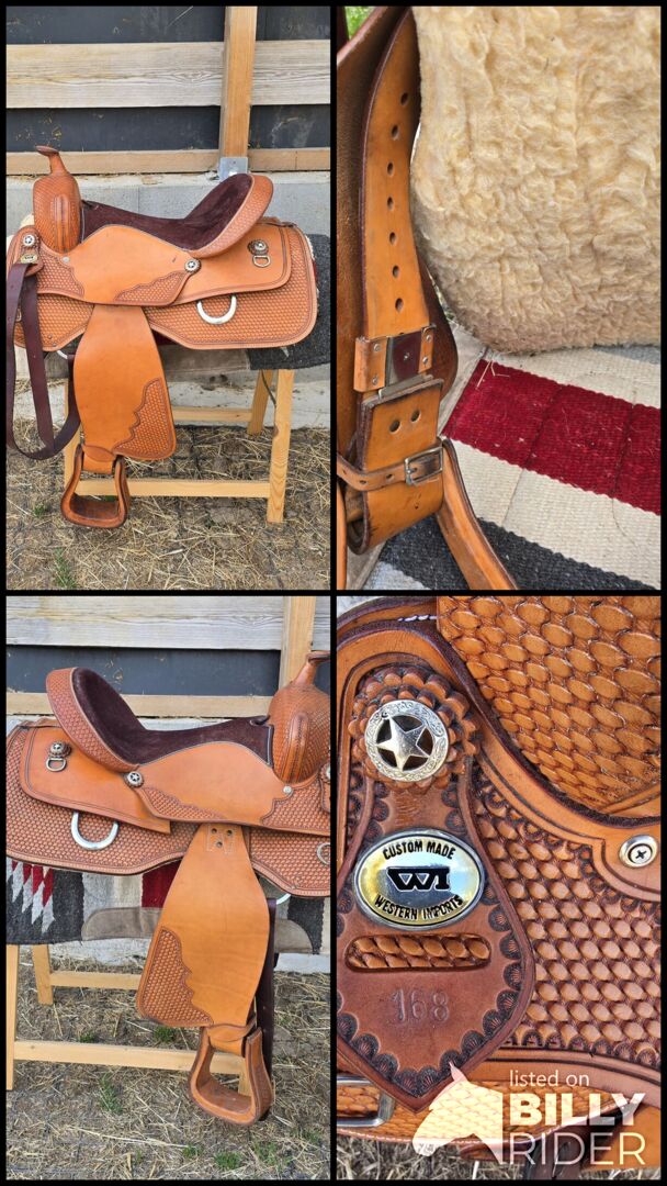 Western Zadel Western Imports Mand Reiner Singel Borstplaat - Ik verkoop mijn westernzadel van het merk Western Imports Basket Reiner in cognac zitmaat 16" met westernpad lamsvacht singel 32" en borstplaat. Het zadel is nauwelijks gebruikt zie foto's. Zie foto's voor afmetingen. Verzending mogelijk tegen kostprijs. Passen en passen is mogelijk op afspraak ter plaatse of met aanbetaling van aankoopprijs mee te nemen.