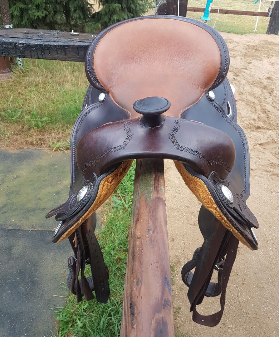 Western Zadel XFQH - Mooi en comfortabel zadel van Westwood in donkerbruin met cognac kleurige zitting te koop. Iets meer dan een jaar oud. Geschikt voor bredere paarden. XFQH boom , 16" zitting , maar past gemakkelijk tot maat 40 . Medium swing . Bordertooling . Uitgedraaide spatborden en mooie conchas met bloemenmotief. Lichte tekenen van slijtage. Inbegrepen is een Matrix Ortho Impact Pad die een Memofoarm vulling heeft en perfect onder het zadel past. Ook een softshell zadelhoes