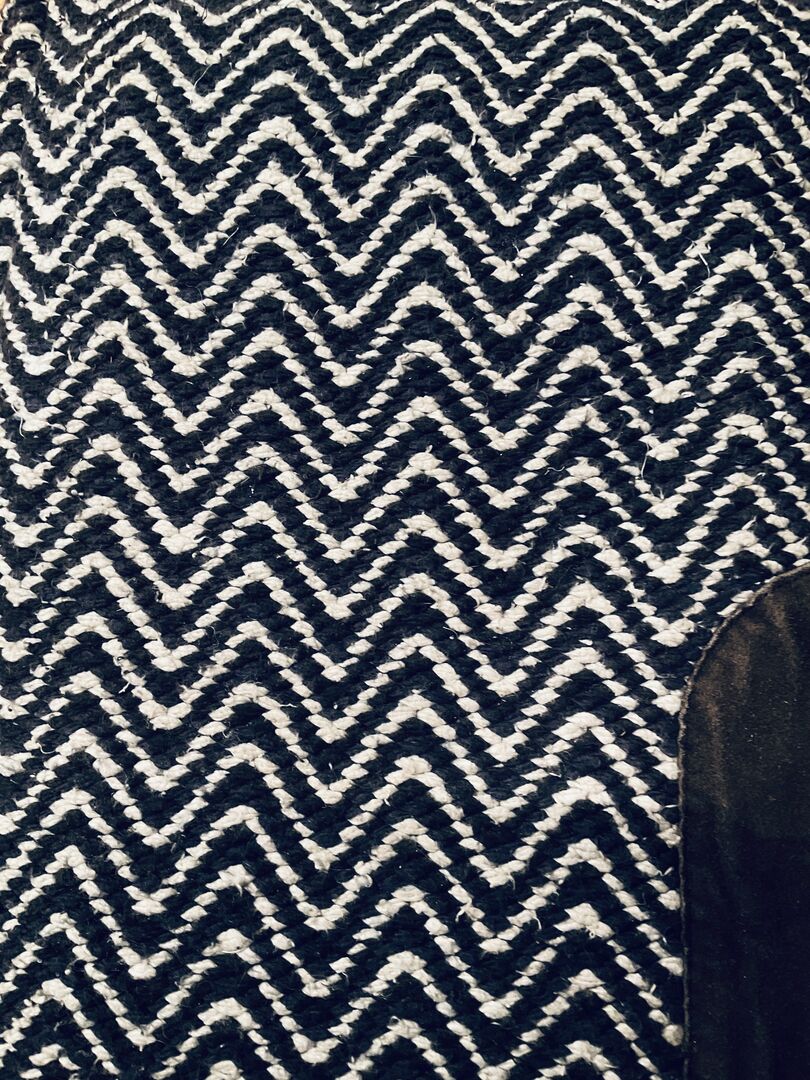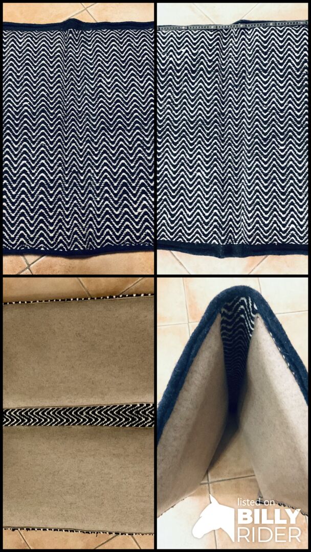 Bovenkant: Klassiek geweven wol in donkerblauw / wit patroon. Onderkant: Zandkleurig 3 mm merinoswolvilt met 2 klittenbandsluitingen aan de achterkant.