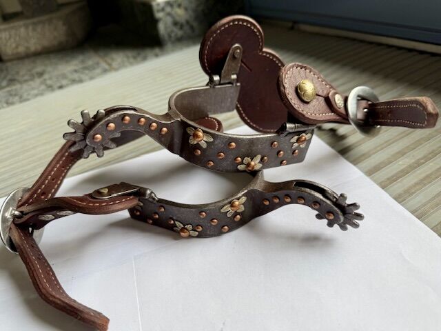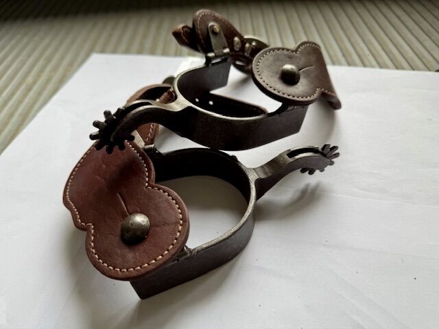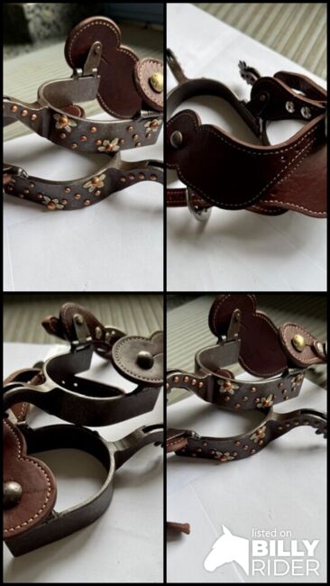 Westernsporen met sporenriemen van Weaver - mooie zware westernsporen met sporenriemen van weverleer: zijriem 2,5cm schacht met 10-punts wiel ca. 6,5cm wiel ca. 3cm spoorbreedte binnen ca. 8cm diepte spoor ca. 8,5cm originele prijs was 79,90 € - voor 50,00 €