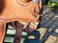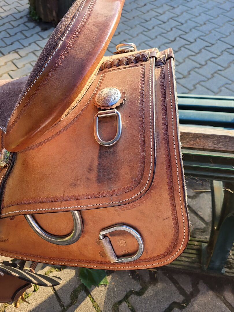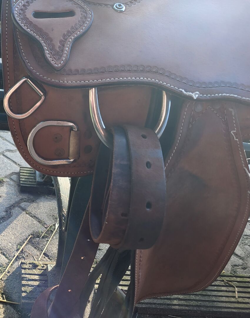 Westernzadel bruin brede zachte zit - Ik verkoop mijn westernzadel met zeer zachte zit. Enkele gebruikssporen (zie foto's), sommige ringen zaten er ooit op, die kunnen zeker bedekt worden met nieuwe. Zie foto's voor afmetingen.