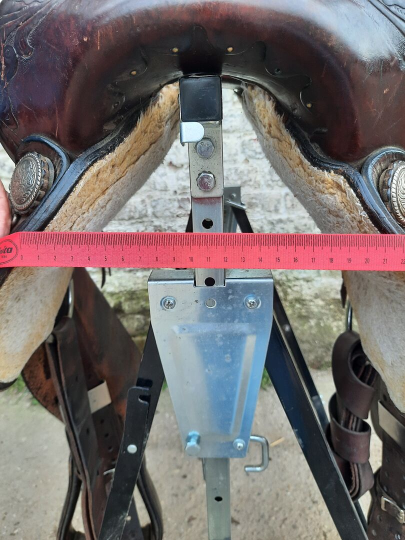 Westernzadel in zeer goede staat - Deze prachtig gemerkte, Tax Tan Herford Brand yoakum is helaas te krap geworden voor mijn jonge paard, wordt daarom niet meer gebruikt en is daarom te koop. Zie de foto's voor de afmetingen. Zadel is gebruikt voor een smal Quarter Horse om in te rijden. Geschikt voor paarden met smalle schouders en korte ruggen.