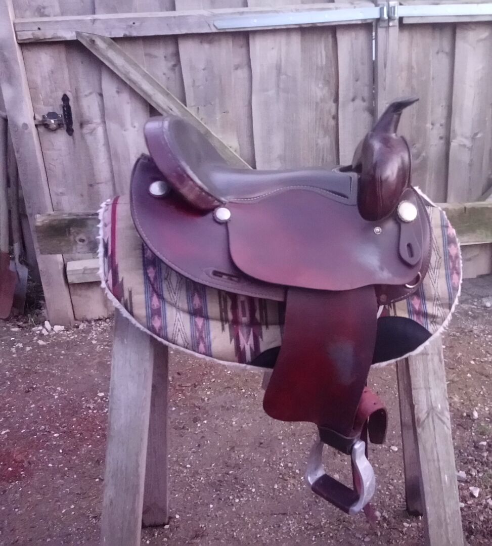 Westernzadel met singel en onderlegger - Ik verkoop mijn gebruikte maar goed onderhouden westernzadel incl. onderlegger en singel (70cm). Het is een Texas Best zadel, model 1346 - zie foto's voor afmetingen. Het zadel is altijd droog opgeslagen geweest en regelmatig onderhouden, maar vertoont een paar tekenen van slijtage (leer gescheurd bij de stijgbeugel - zie foto's). Het gewicht is ongeveer 12 kg. Neem contact met ons op als je vragen hebt.