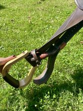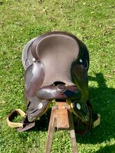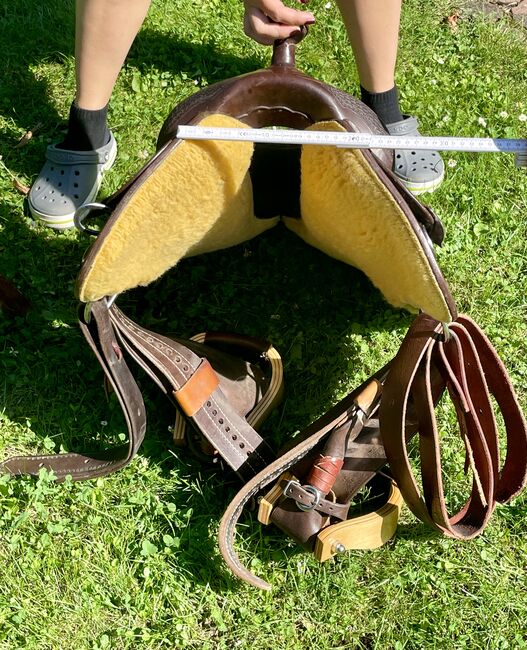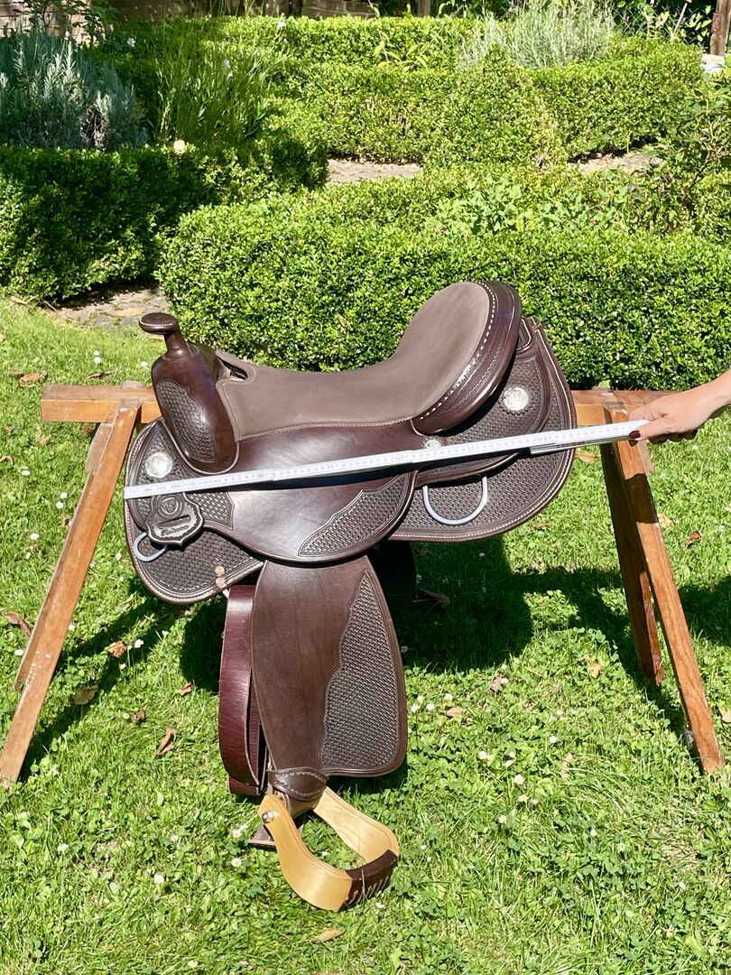 Westernzadel Triple W Platinum Klein Vlinder - Te koop een gebruikt westernzadel in zeer goede staat, merk Triple W Platinum Small Butterfly. Kleur Donker Olie Boom 8660-02 Kamerbreedte 2 Bevat uitgedraaide fenders Het zadel is kort en smal. Dit is een particuliere verkoop, geen garantie, geen retouren.