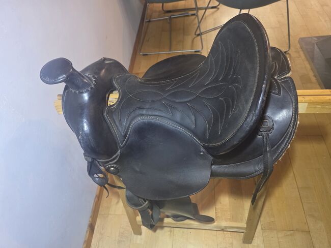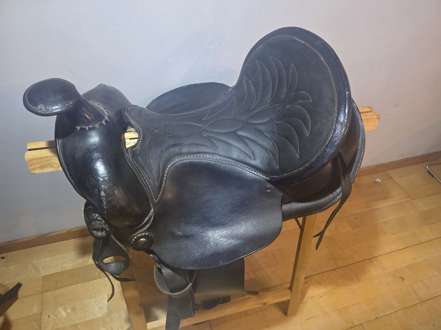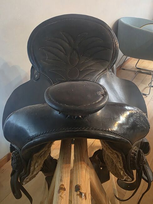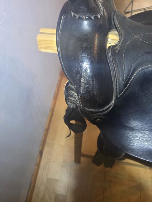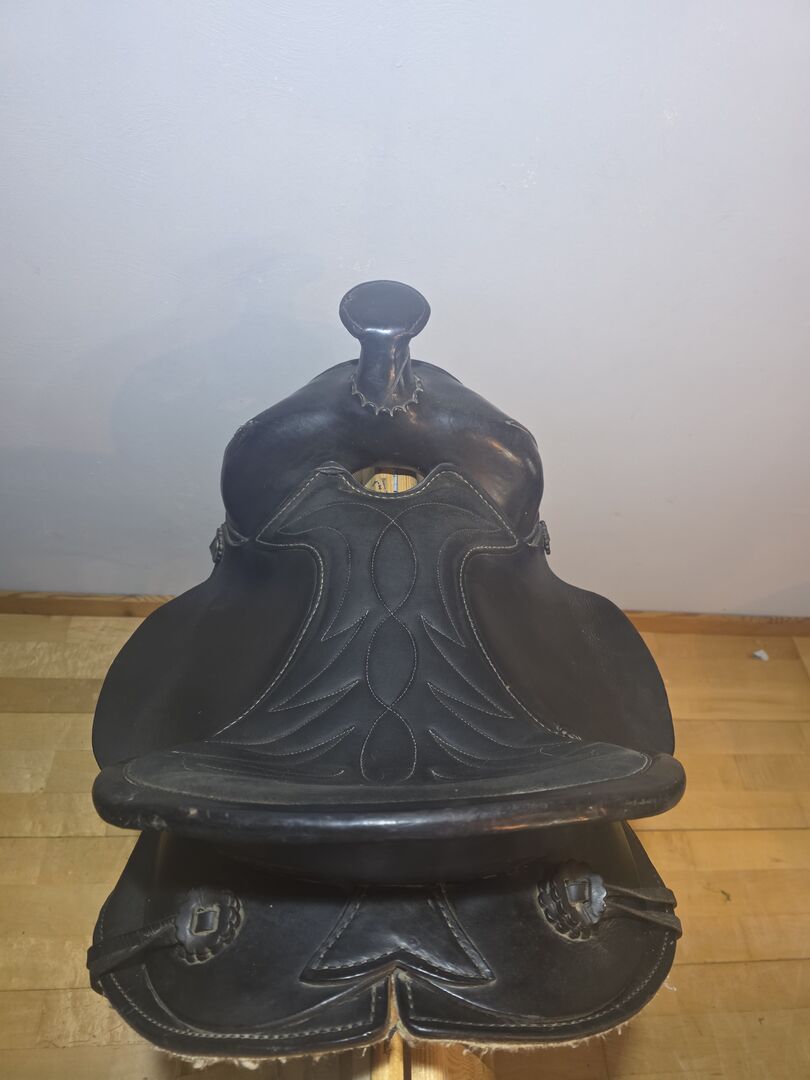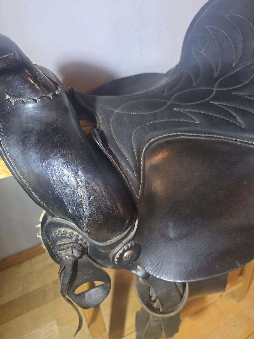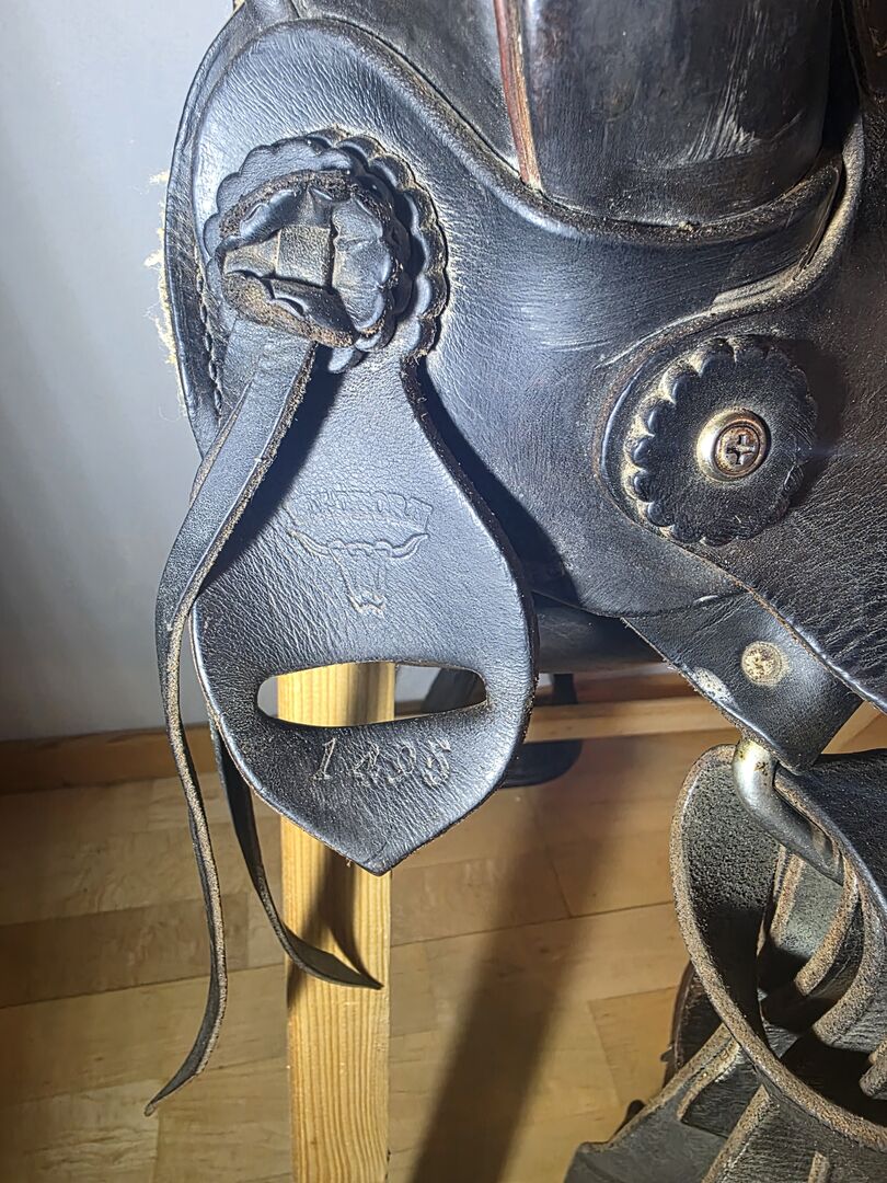 Conditie: Aanzienlijke tekenen van slijtage op het leer (vooral op de vork/hoorn, zie detailfoto's), maar functioneel klaar voor de volgende ronde.