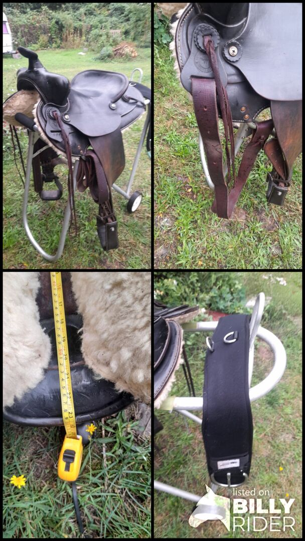 Westernzadel Winnipeg Rawhide Canada 16 inch smal paarden - Ik bied een heel mooi ouder westernzadel aan van de Canadese zadelmakerij Winnipeg. Het zadel heeft een zitmaat van 16 inch en past goed op smallere paarden. Ik heb ongeveer 19 cm tussen de conchas gemeten (zie foto's). Het heeft een totaal contactoppervlak van 60 cm. Het zadel wordt verkocht met alle singels, een western korte singel, zadeldekje en zadelkar. Vanwege de grootte wordt het bij voorkeur aangeboden om op te halen.