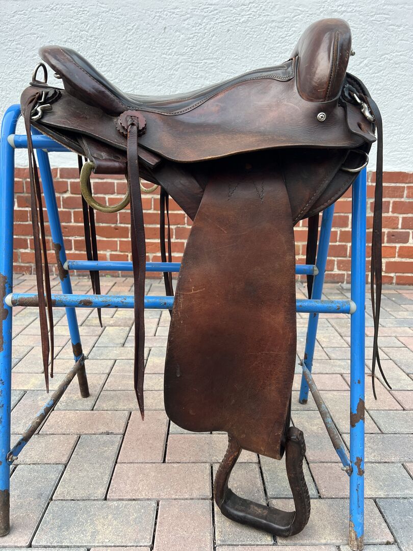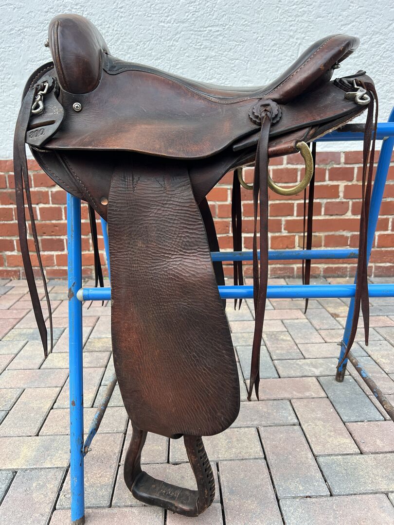 Westernzadel zonder hoorn / Endurance-zadel - Te koop aangeboden is een endurance zadel / westernzadel zonder hoorn van het merk Texas Best met het modelnummer 800 ab. Rugcinch en zadeltuig zijn ook inbegrepen. Het is geschikt voor normaal/smal gebouwde paarden of pony's met een rechte rug, weinig schommel en schoft. (Ik heb het gebruikt op een Duitse rijpony en een sportieve Noor. De vele bevestigingsmogelijkheden met drukknopen en leren riemen maken het ideaal voor trail- of endurance rijden. Houten boom bedekt met runderhuid en messing ringen. De afmetingen zijn: Lengte: ca. 54cm Zitgedeelte: 40cm = 16 inch Tussen de conchas: ca. 17cm opent breed aan de onderkant: 28cm Gewicht ca. 12kg Het zadel is altijd met zorg behandeld en kan direct gebruikt worden. Ook geschikt om jonge paarden te laten wennen aan het zadel. Te goed voor een houten paard.